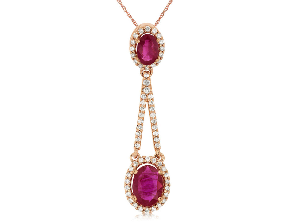 14KT ROSE GOLD FLOATING PENDANT. 3D HALO CLASSIC DESIGN. ROUND DIAMONDS ARE F/G COLOR, VSSI CLARITY .32 CARATS. AAA OVAL RUBIES ARE 1.80 CARATS. COMES ON A 14KT GOLD DIAMOND CUT 16" INCH CHAIN. WRITTEN APPRAISAL AVAILABLE. COMES IN A PRESENTABLE GIFT BOX.
