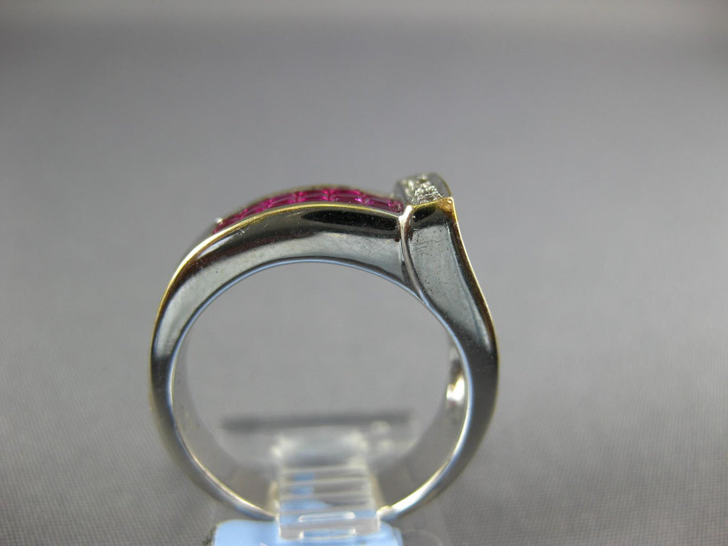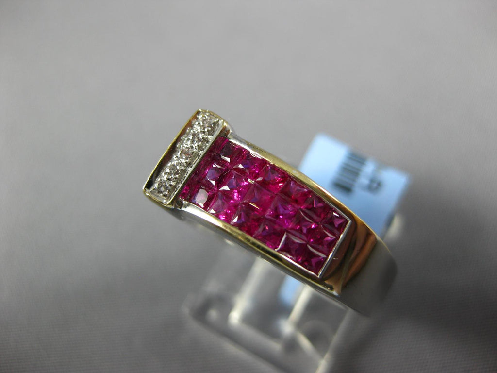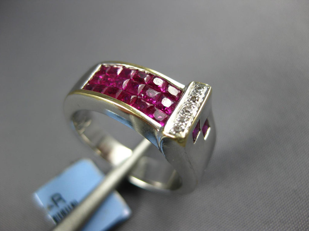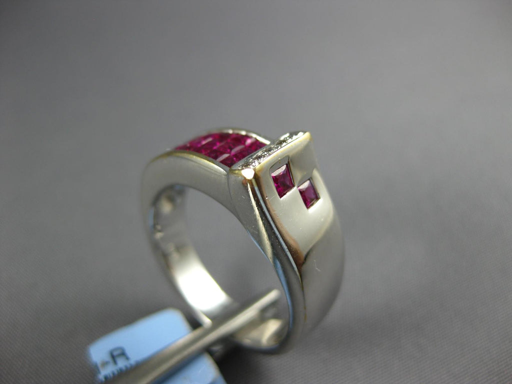 18KT WHITE GOLD MENS RING. 3D INVISIBLE ETOILE DESIGN. ROUND DIAMONDS ARE F/G COLOR, VS CLARITY .04 CARATS. AAA PRINCESS CUT RUBIES ARE 2.08 CARATS. MEASURES 8mm WIDE. RING SIZE 7.5. CAN BE SIZED BY OUR MASTER JEWELER UPON REQUEST. WRITTEN APPRAISAL AVAILABLE. COMES IN A PRESENTABLE GIFT BOX.