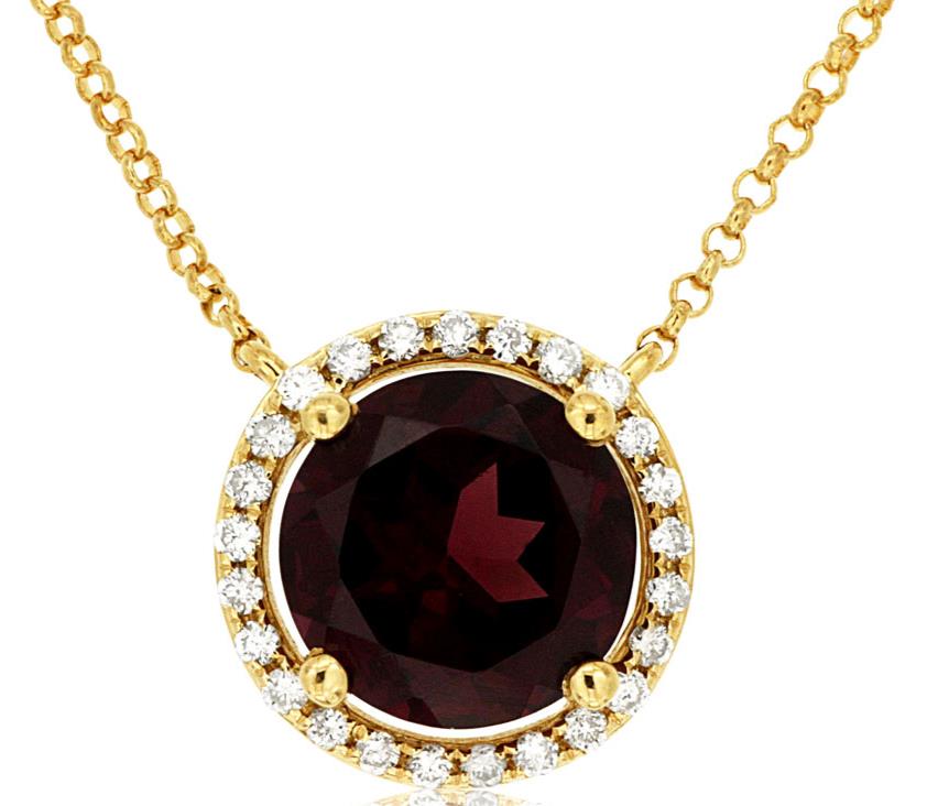 2.14CT DIAMOND & AAA RHODOLITE 14KT YELLOW GOLD CLASSIC ROUND HALO LOVE NECKLACE