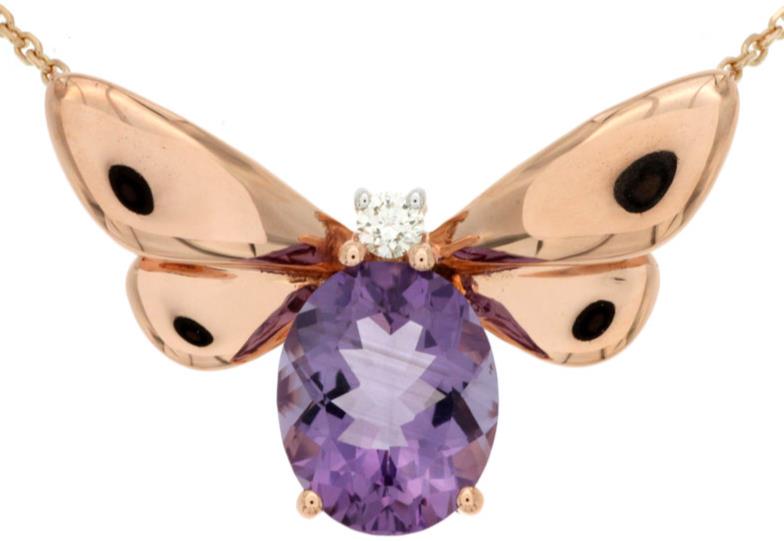 14KT ROSE GOLD LOVE NECKLACE. 3D BUTTERFLY DESIGN. ROUND DIAMONDS ARE F/G COLOR, VSSI CLARITY .06 CARATS. AAA EXTRA FACETED OVAL AMETHYST IS 2.10 CARATS. 17" INCHES LONG. WRITTEN APPRAISAL AVAILABLE. COMES IN A PRESENTABLE GIFT BOX.