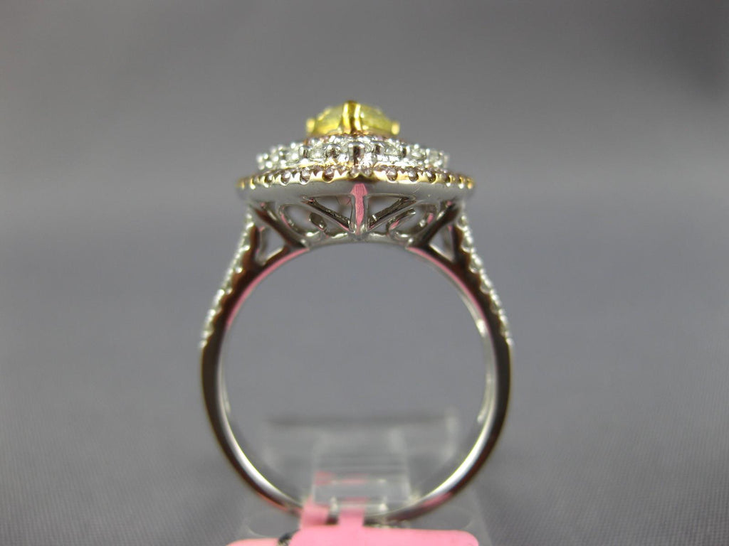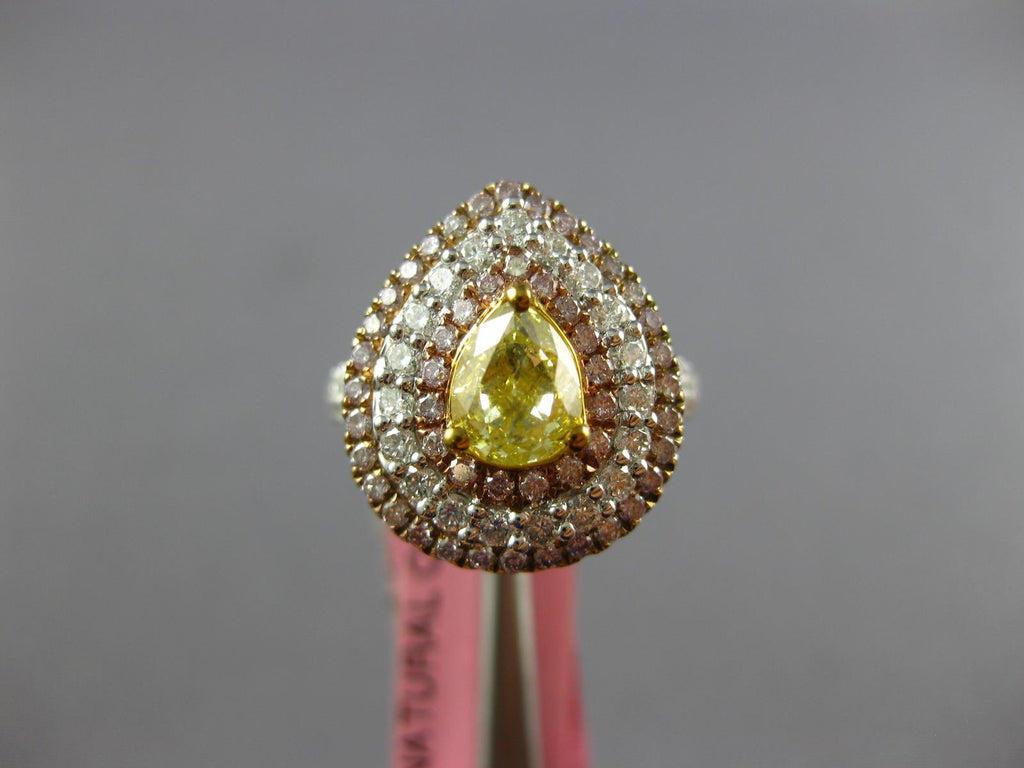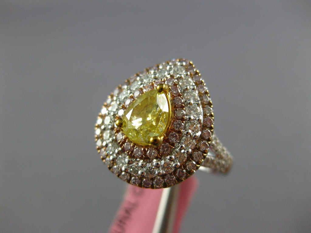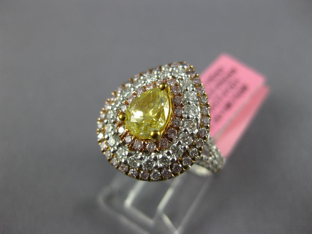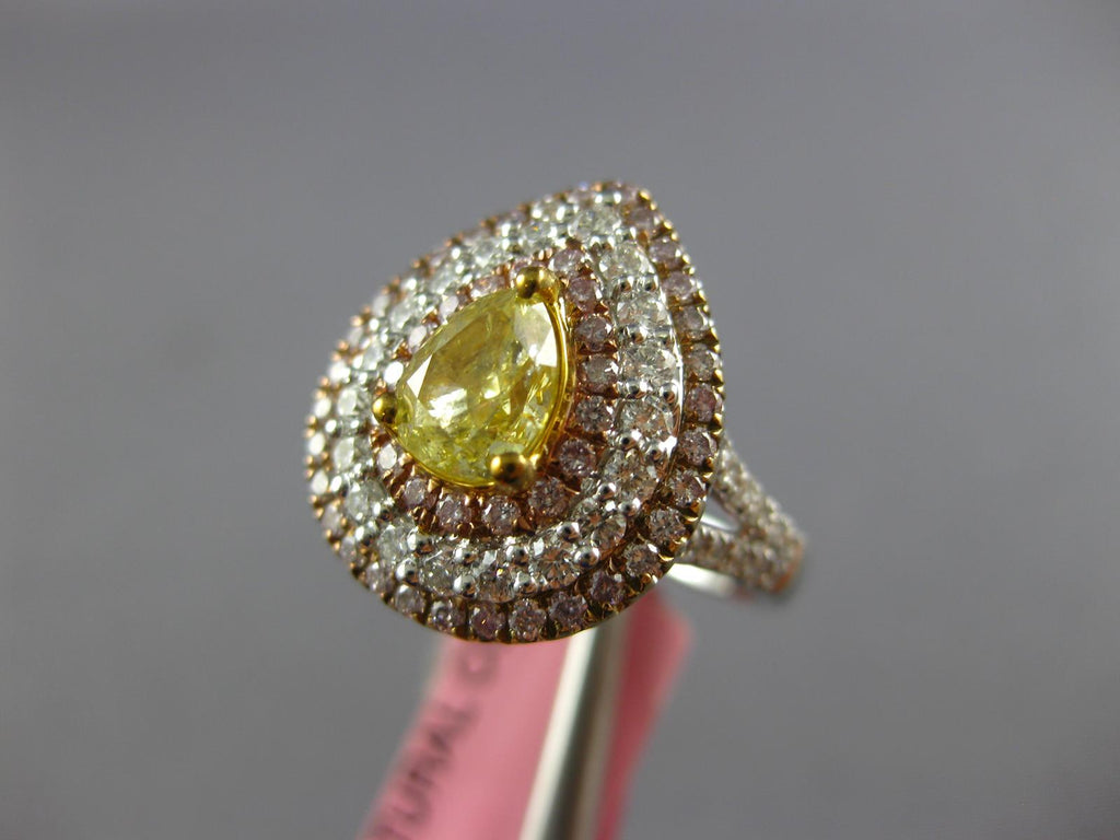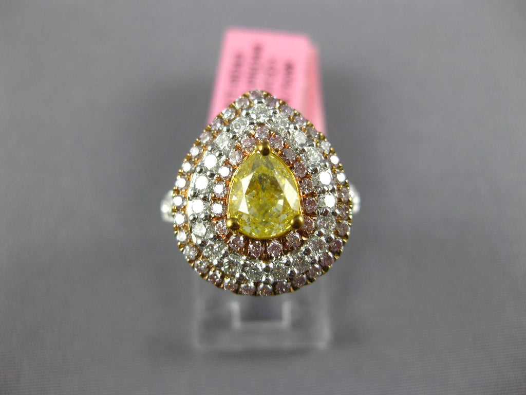 18KT WHITE AND YELLOW GOLD ENGAGEMENT RING. 3D CLASSIC HALO DESIGN. WHITE DIAMONDS ARE F/G COLOR, VSSI CLARITY .68 CARATS. CENTER PEAR SHAPE CANARY DIAMOND IS 1.01 CARATS. PINK DIAMONDS ARE .47 CARATS. MEASURES 17mm WIDE. RING SIZE 6.5. CAN BE SIZED BY MASTER JEWELER UPON REQUEST. WRITTEN APPRAISAL AVAILABLE. COMES IN A PRESENTABLE GIFT BOX.