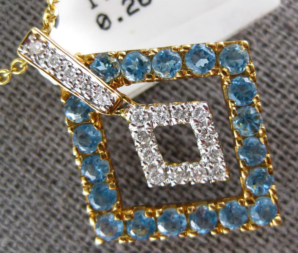 18KT YELLOW GOLD FUN FLOATING PENDANT. 3D SIDEWAYS SQUARE DESIGN. DIAMONDS ARE F/G COLOR, VSSI CLARITY .26 CARATS. AAA BLUE TOPAZ ARE 1.91 CARATS. MEASURES 26mm X 21mm. COMES ON A 14KT GOLD DIAMOND CUT 16" INCH CHAIN. WRITTEN APPRAISAL AVAILABLE. COMES IN A PRESENTABLE GIFT BOX.