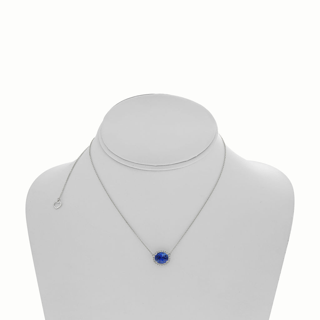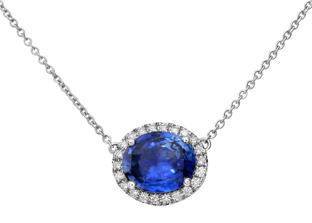 18KT WHITE GOLD LOVE NECKLACE. 3D CLASSIC HALO DESIGN. ROUND DIAMONDS ARE F/G COLOR, VSSI CLARITY .17 CARATS. AAA OVAL SAPPHIRE IS 2.01 CARATS. MEASURES 9.1mm X 12.88mm. 17" INCHES LONG. WRITTEN APPRAISAL AVAILABLE. COMES IN A PRESENTABLE GIFT BOX.