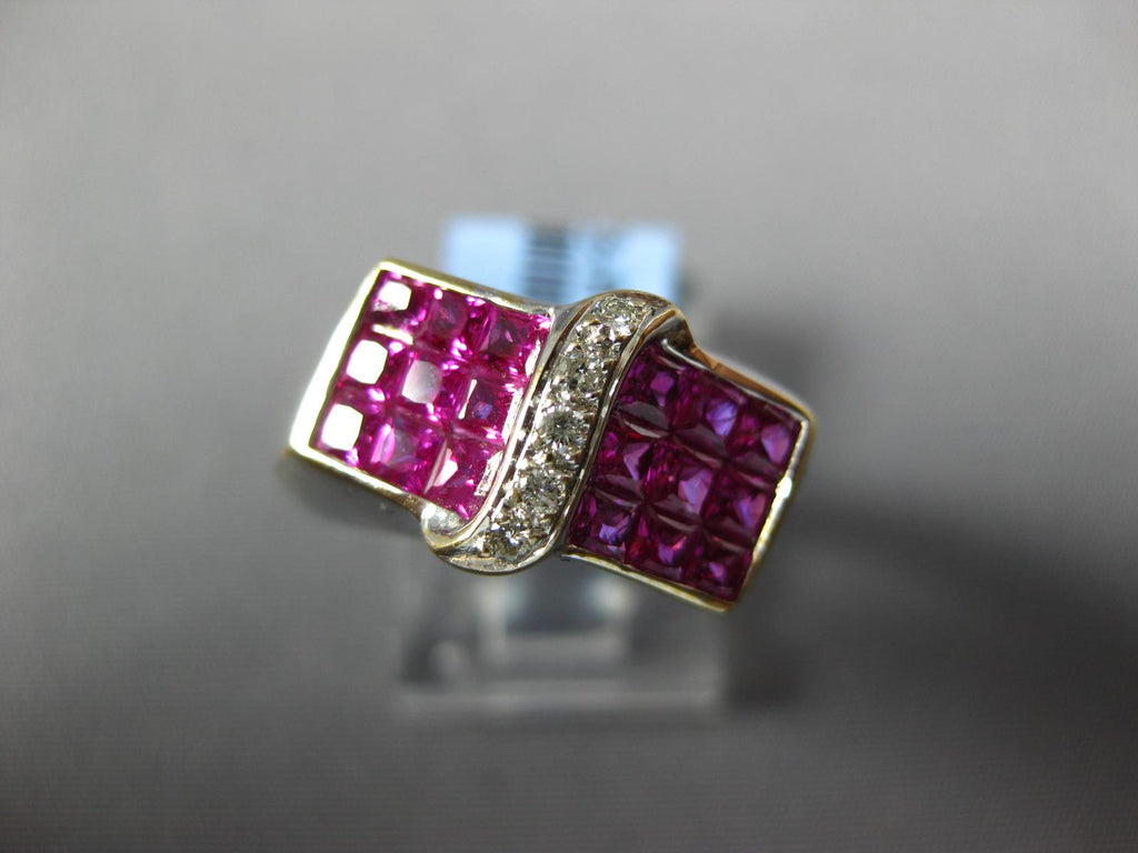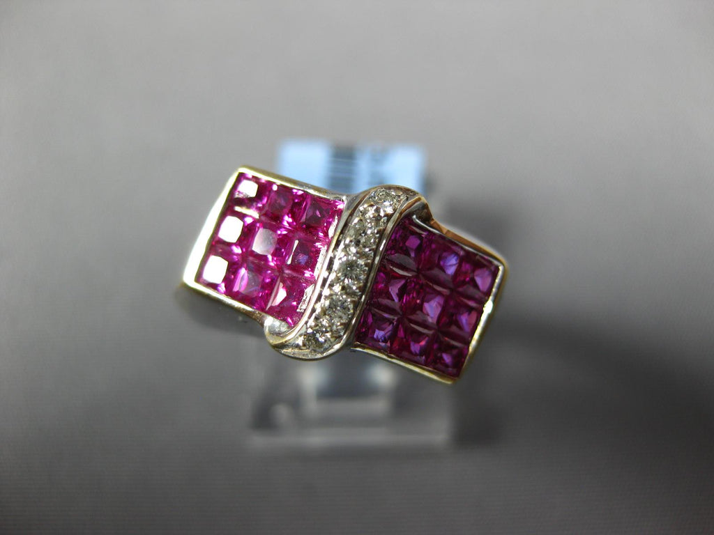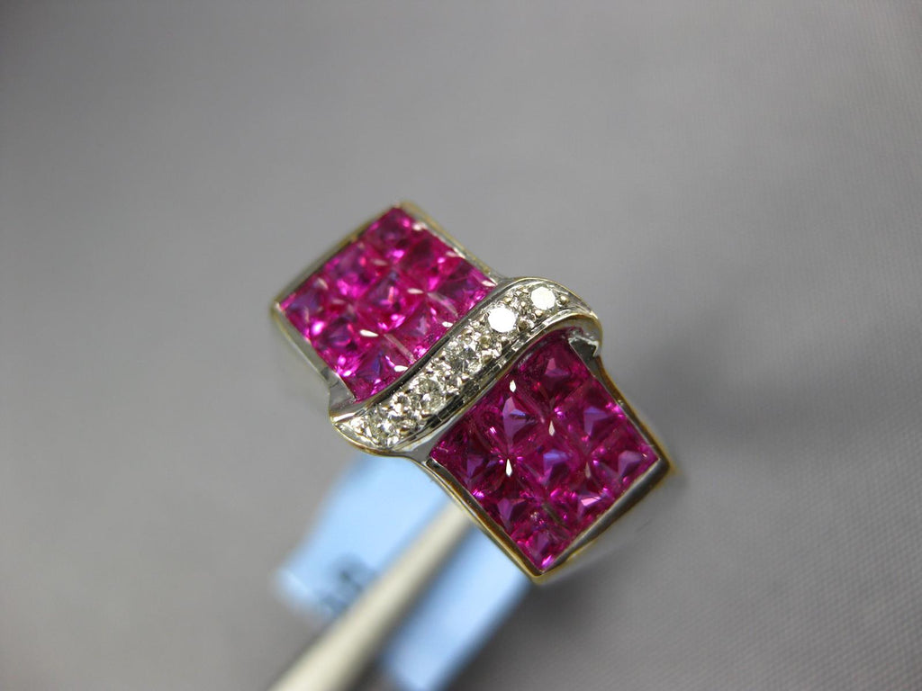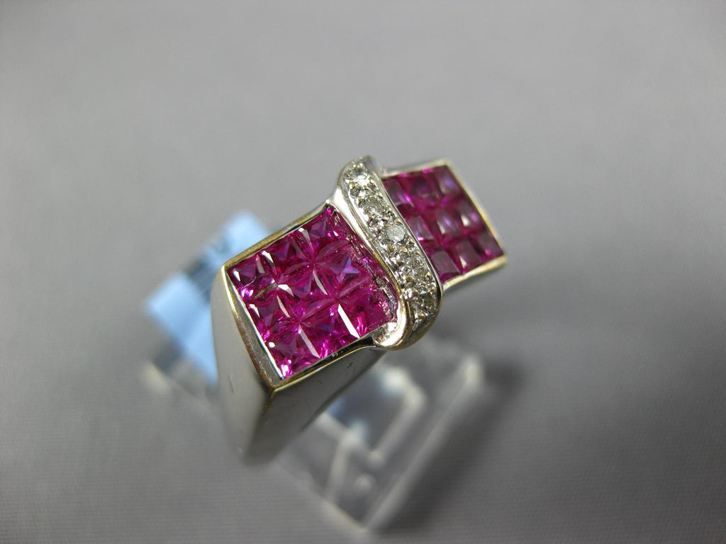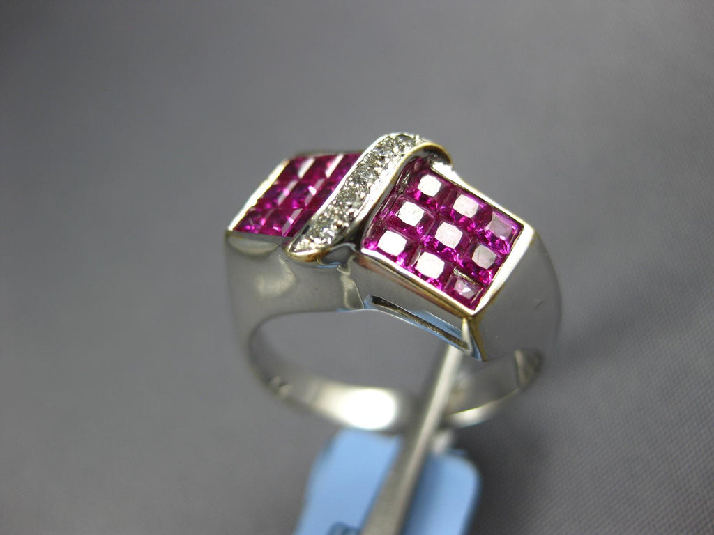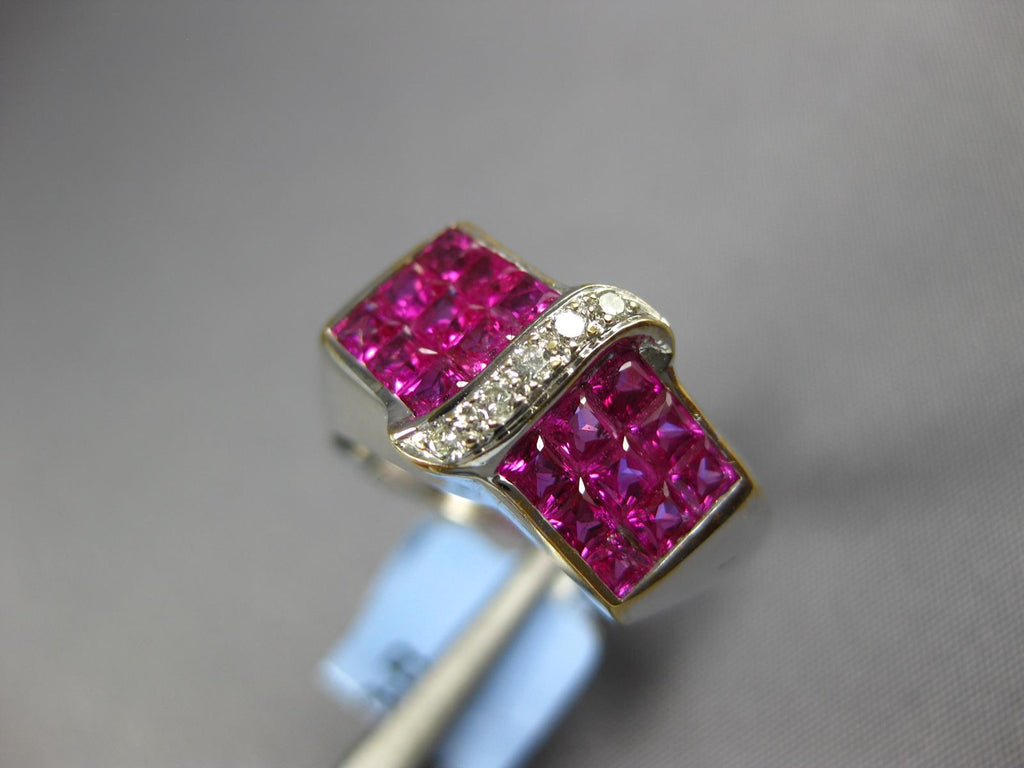 18KT WHITE GOLD FUN RING. 3D MULTI ROW INVISIBLE RECTANGULAR DESIGN. ROUND DIAMONDS ARE F/G COLOR, VS CLARITY .07 CARATS. AAA PRINCESS CUT RUBIES ARE 2.14 CARATS. MEASURES 9mm WIDE. RING SIZE 7.75. CAN BE SIZED BY OUR MASTER JEWELER UPON REQUEST. WRITTEN APPRAISAL AVAILABLE. COMES IN A PRESENTABLE GIFT BOX.