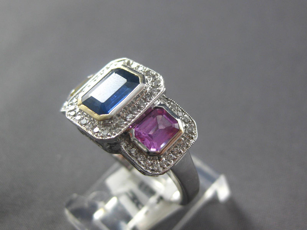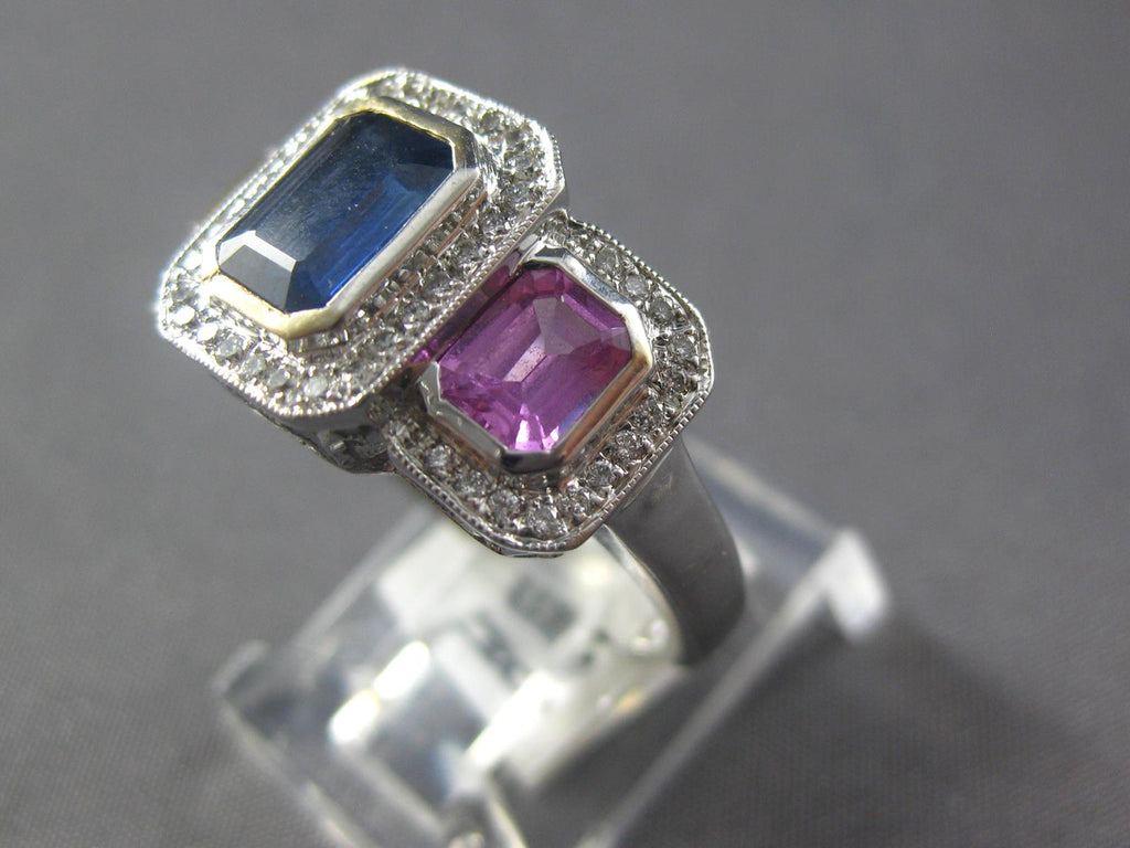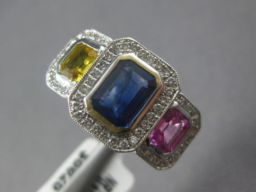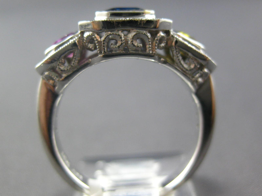 18KT WHITE GOLD STATEMENT FUN RING. 3D THREE STONE FILIGREE DESIGN. ROUND DIAMONDS ARE F/G COLOR, VSSI CLARITY .36 CARATS. AAA BAGUETTE MULTI COLOR SAPPHIRES ARE 1.85 CARATS. MEASURES 12mm WIDE. RING SIZE 6.75. CAN BE SIZED BY OUR MASTER JEWELER UPON REQUEST. WRITTEN APPRAISAL AVAILABLE. COMES IN A PRESENTABLE GIFT BOX.