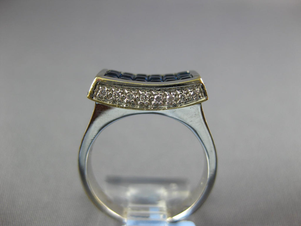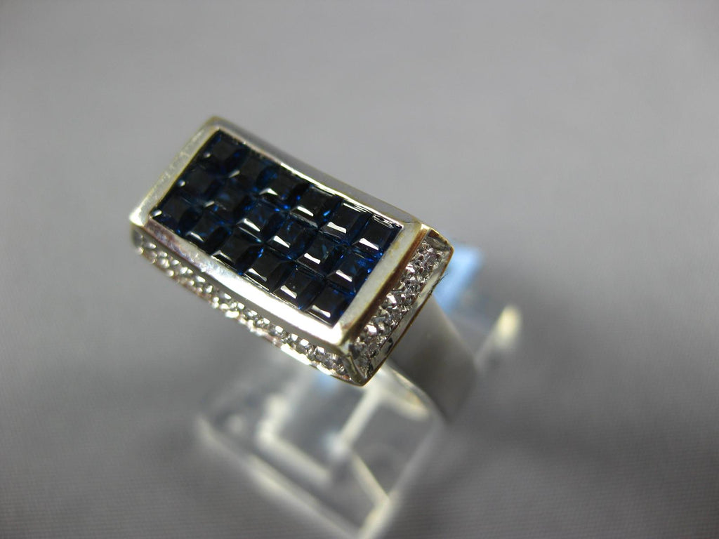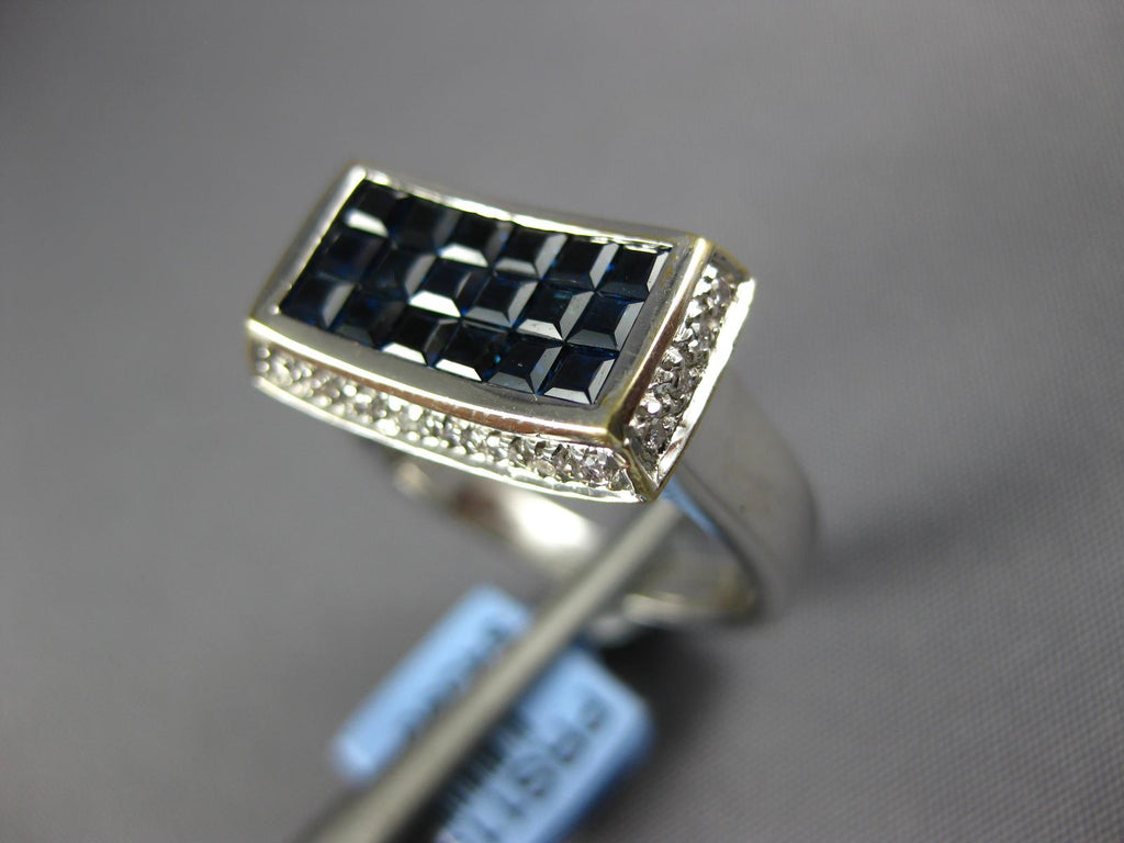 18KT WHITE GOLD FUN RING. 3D INVISIBLE RECTANGULAR DESIGN. ROUND DIAMONDS ARE F/G COLOR, VS CLARITY .18 CARATS. AAA PRINCESS SAPPHIRES ARE 2.08 CARATS. MEASURES 9mm WIDE. RING SIZE 7.5. CAN BE SIZED BY OUR MASTER JEWELER UPON REQUEST. WRITTEN APPRAISAL AVAILABLE. COMES IN A PRESENTABLE GIFT BOX.