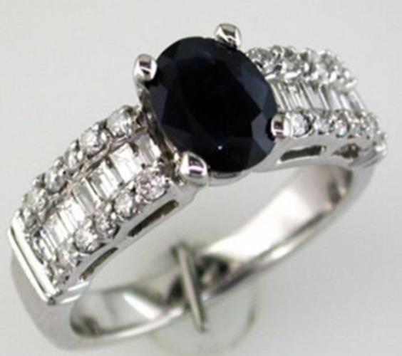 14KT WHITE GOLD ENGAGEMENT RING. 3D CLASSIC DESIGN. ROUND AND BAGUETTE DIAMONDS ARE F/G COLOR, VSSI CLARITY .78 CARATS. AAA OVAL SAPPHIRE IS 1.55 CARATS. RING SIZE 7. CAN BE SIZED BY OUR MASTER JEWELER UPON REQUEST. WRITTEN APPRAISAL AVAILABLE. COMES IN A PRESENTABLE GIFT BOX.