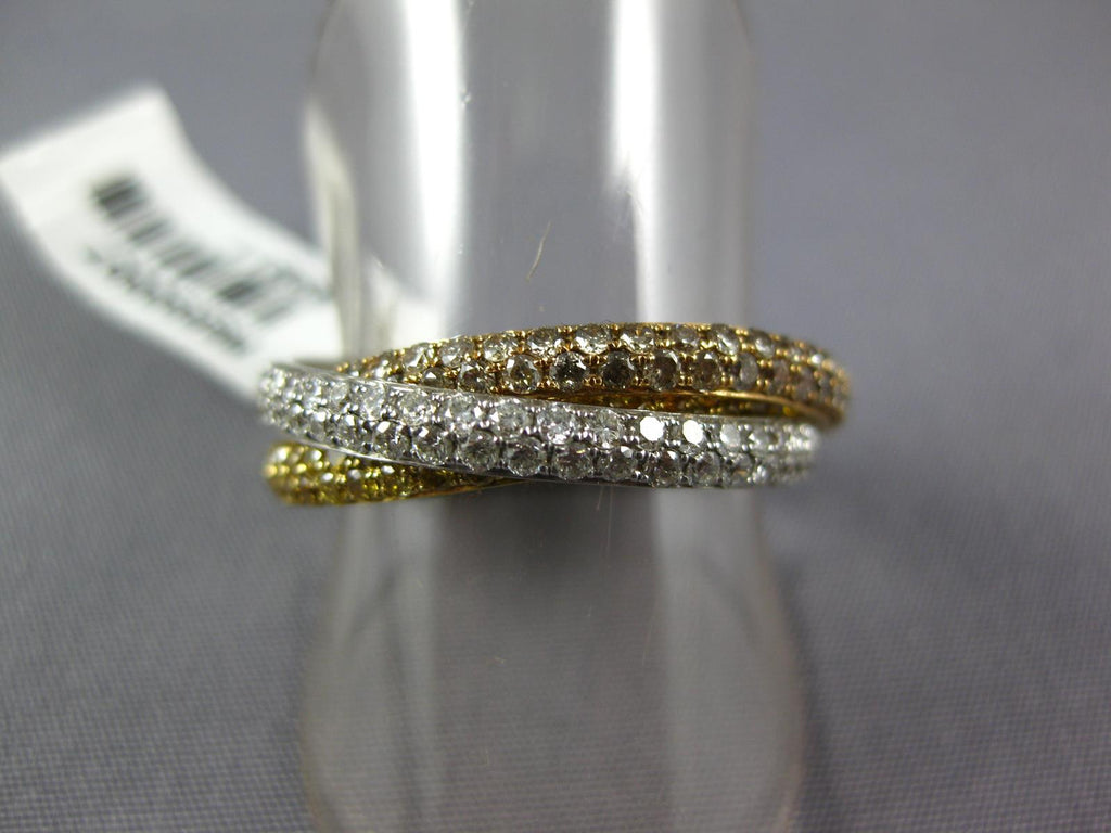 18KT WHITE, YELLOW, AND ROSE GOLD ANNIVERSARY RING. 3D TRINITY ETERNITY DESIGN. WHITE DIAMONDS ARE F/G COLOR, VSSI CLARITY. WHITE AND FANCY YELLOW DIAMONDS ARE 2.46 CARATS. EACH RING MEASURES 2.5mm WIDE. RING SIZE 7. CAN BE SIZED BY OUR MASTER JEWELER UPON REQUEST. WRITTEN APPRAISAL AVAILABLE. COMES IN A PRESENTABLE GIFT BOX.