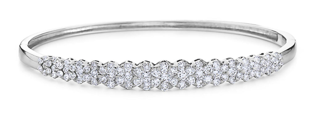 18KT WHITE GOLD FUN LOVE BANGLE BRACELET. 3D MULTI FLOWER GRADUATING SEMI ETERNITY DESIGN. DIAMONDS ARE F/G COLOR, VSSI CLARITY 2.47 CARATS. 7" INCHES LONG. WRITTEN APPRAISAL AVAILABLE. COMES IN A PRESENTABLE GIFT BOX.