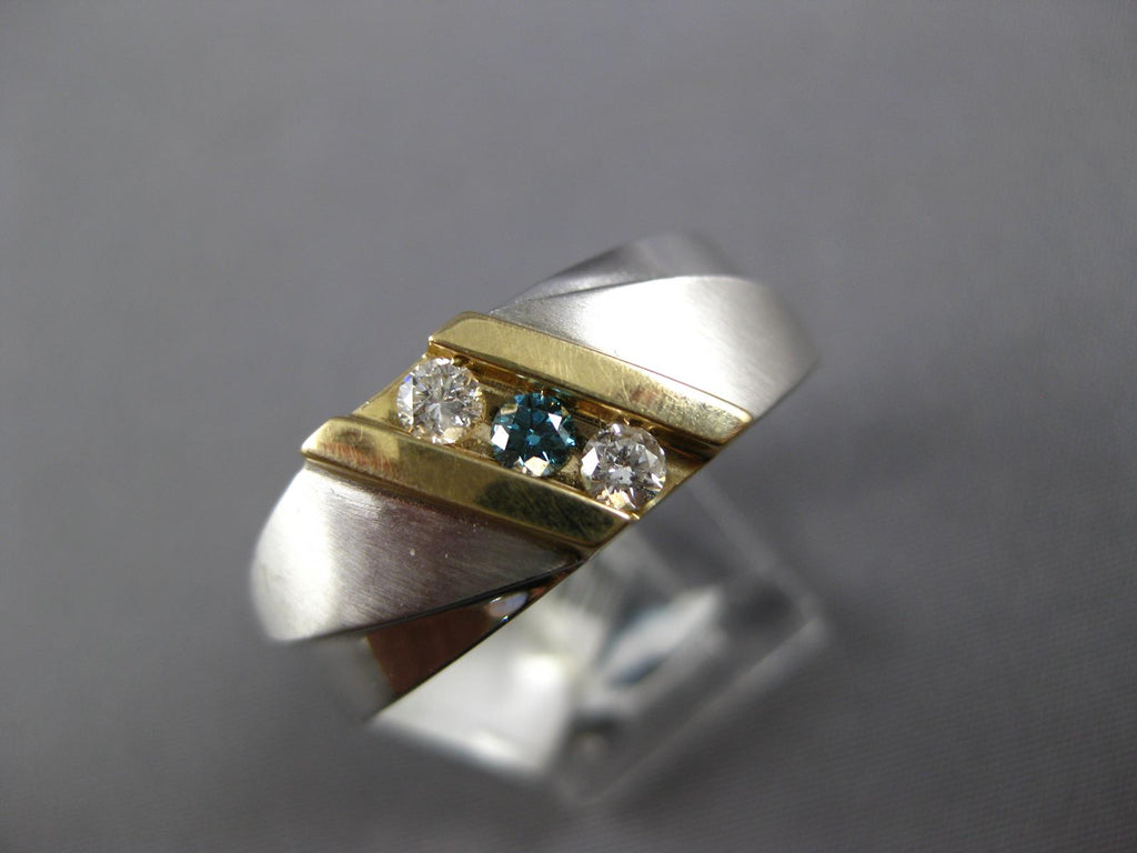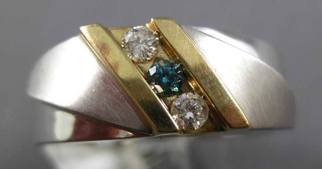 14KT WHITE AND YELLOW GOLD MENS RING. 3D THREE STONE DIAGONAL MATTE AND SHINY CLASSIC DESIGN. DIAMONDS ARE F/G COLOR, VSSI CLARITY. WHITE AND BLUE DIAMONDS ARE .25 CARATS. MEASURES 8mm WIDE. RING SIZE 10.5. CAN BE SIZED BY OUR MASTER JEWELER UPON REQUEST. WRITTEN APPRAISAL AVAILABLE. COMES IN A PRESENTABLE GIFT BOX.