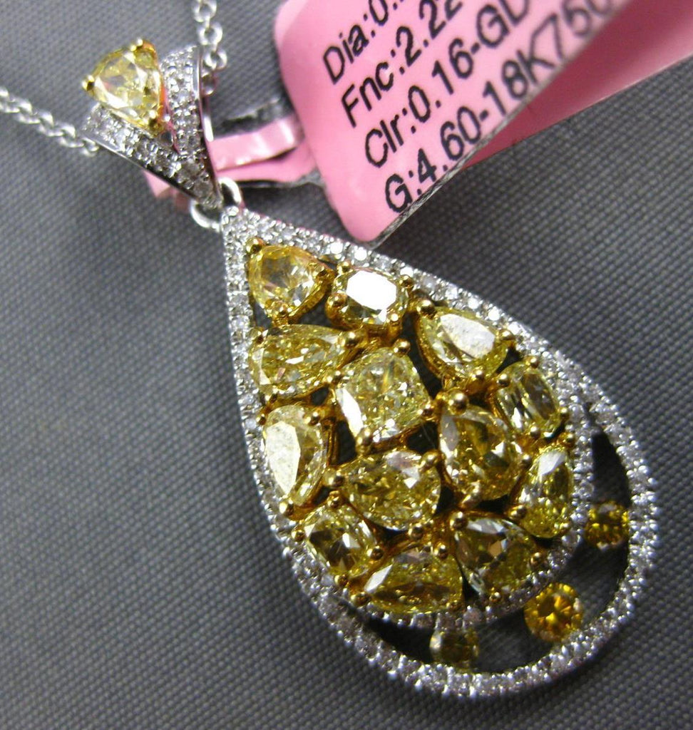 18KT WHITE AND YELLOW GOLD FLOATING PENDANT. 3D CLUSTER TEAR DROP DESIGN. WHITE DIAMONDS ARE F/G COLOR, VS CLARITY .26 CARATS. MULTI SHAPE FANCY YELLOW DIAMONDS ARE 2.38 CARATS. MEASURES 31mm X 14.5mm. COMES ON A 14KT GOLD DIAMOND CUT 16" INCH CHAIN. WRITTEN APPRAISAL AVAILABLE. COMES IN A PRESENTABLE GIFT BOX.