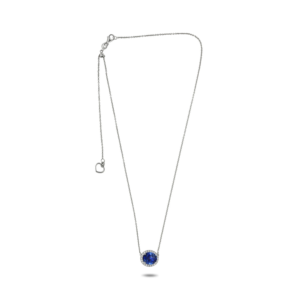 18KT WHITE GOLD LOVE NECKLACE. 3D CLASSIC HALO DESIGN. ROUND DIAMONDS ARE F/G COLOR, VSSI CLARITY .16 CARATS. AAA OVAL SAPPHIRE IS 2.53 CARATS. MEASURES 12.74mm X 10.52mm. 17" INCHES LONG. WRITTEN APPRAISAL AVAILABLE. COMES IN A PRESENTABLE GIFT BOX.