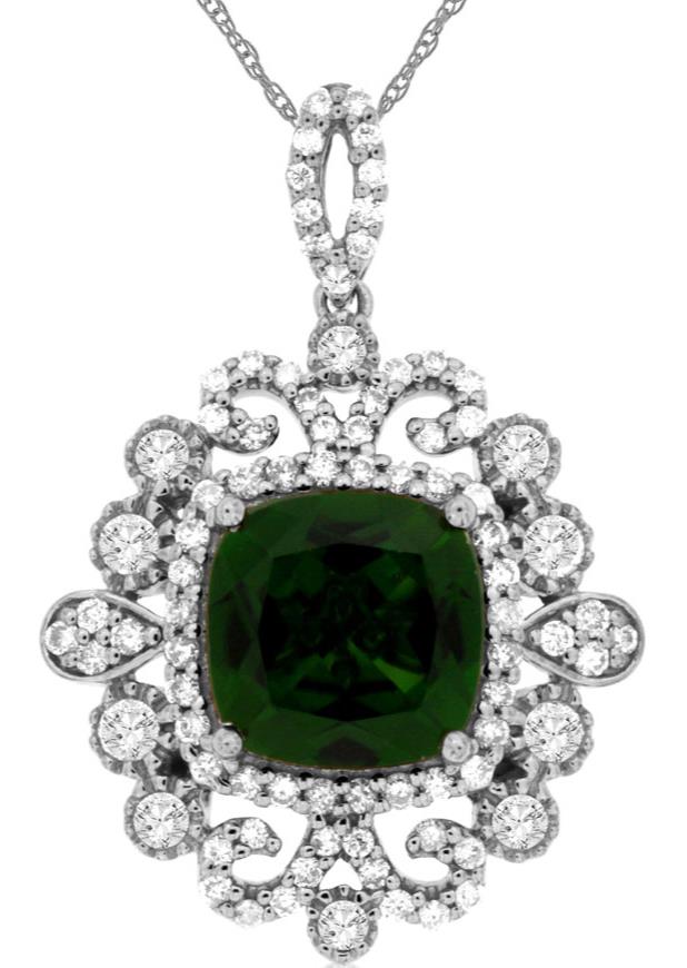 2.72CT DIAMOND & AAA GREEN GARNET 14K WHITE GOLD CUSHION FILIGREE FLOWER PENDANT