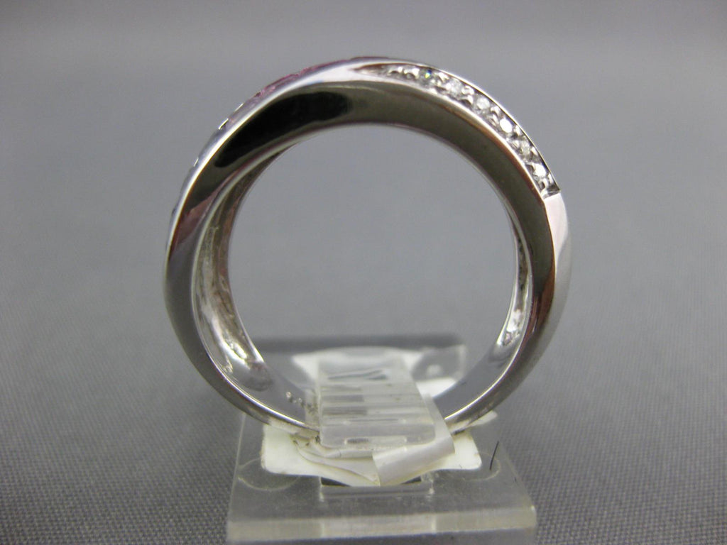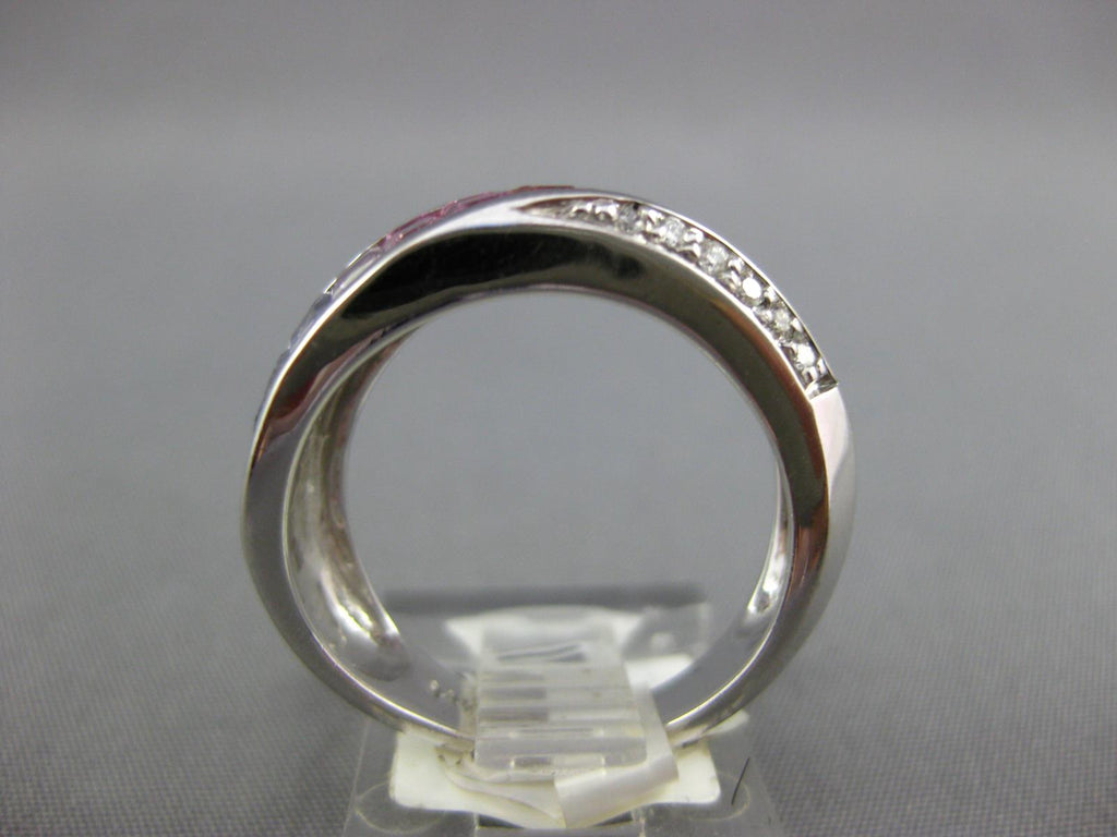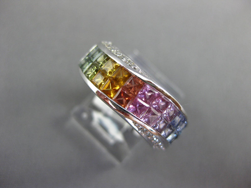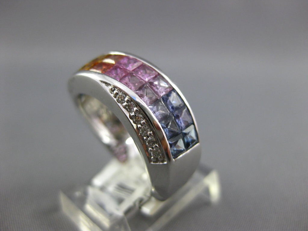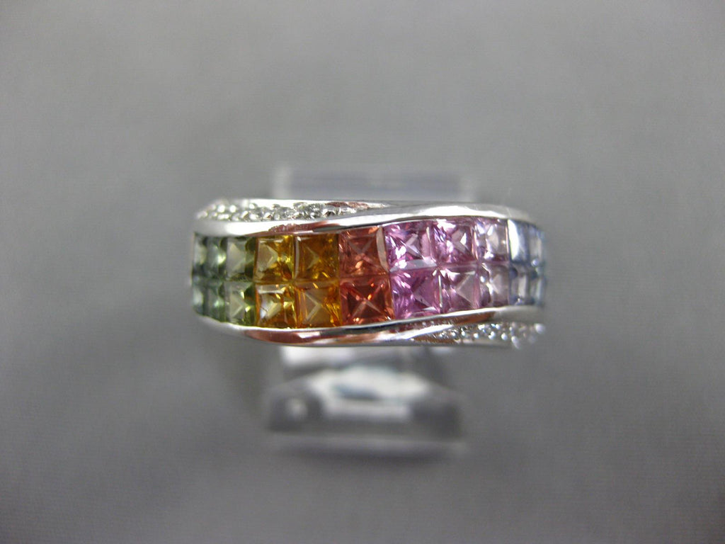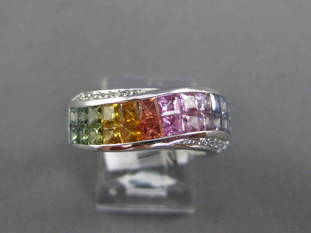 14KT WHITE GOLD FUN RING. 3D INVISIBLE DESIGN. ROUND DIAMONDS ARE F/G COLOR, VSSI CLARITY .12 CARATS. AAA PRINCESS CUT RAINBOW MULTI COLOR SAPPHIRES ARE 2.60 CARATS. MEASURES 7.5mm WIDE. RING SIZE 7. CAN BE SIZED BY OUR MASTER JEWELER UPON REQUEST. WRITTEN APPRAISAL AVAILABLE. COMES IN A PRESENTABLE GIFT BOX.