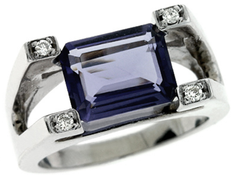 14KT WHITE GOLD FUN MENS RING. 3D CLASSIC DESIGN. ROUND DIAMONDS ARE F/G COLOR, VSSI CLARITY .07 CARATS. AAA EMERALD CUT IOLITE IS 2.75 CARATS. MEASURES 9mm WIDE. RING SIZE 6.5. CAN BE SIZED BY OUR MASTER JEWELER UPON REQUEST. WRITTEN APPRAISAL AVAILABLE. COMES IN A PRESENTABLE GIFT BOX.