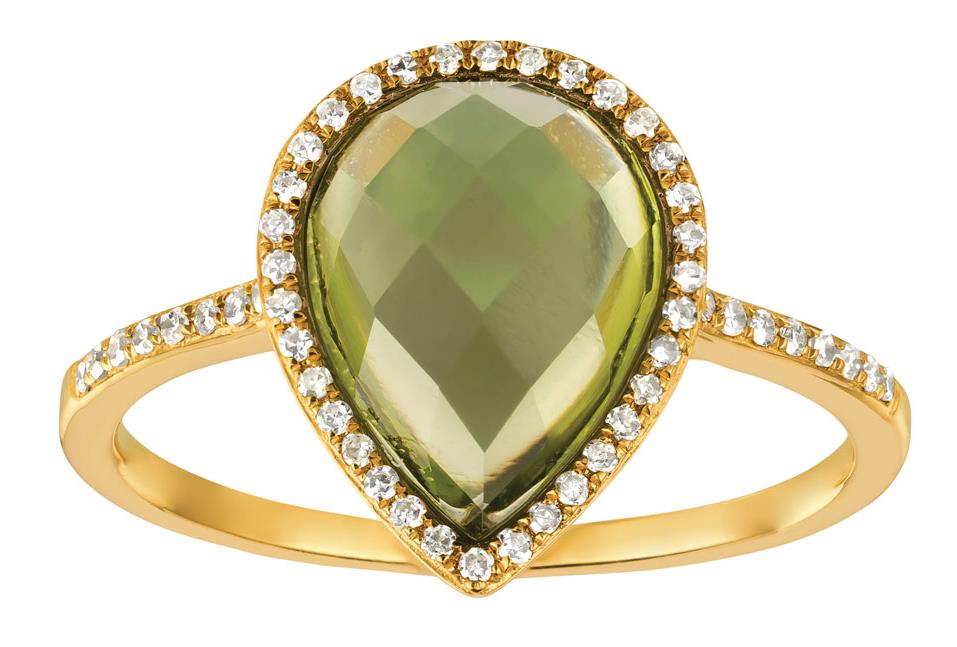 14KT YELLOW GOLD FUN RING. 3D CLASSIC HALO DESIGN. ROUND DIAMONDS ARE F/G COLOR, VSSI CLARITY .17 CARATS. AAA EXTRA FACETED PEAR SHAPE PERIDOT IS 2.80 CARATS. RING SIZE 7. CAN BE SIZED BY OUR MASTER JEWELER UPON REQUEST. WRITTEN APPRAISAL AVAILABLE. COMES IN A PRESENTABLE GIFT BOX.
