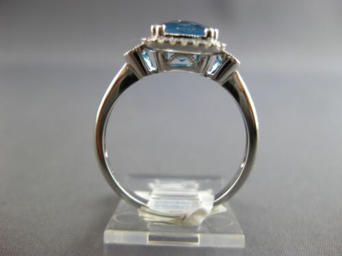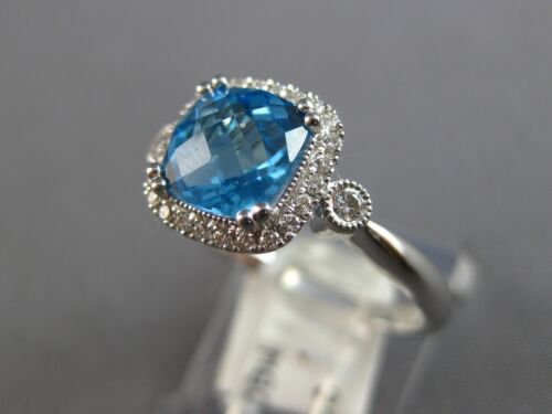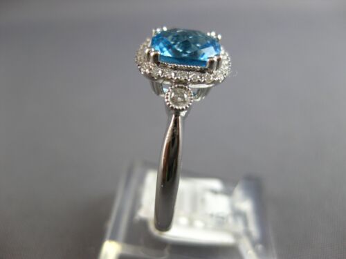 14KT WHITE GOLD ENGAGEMENT RING. 3D CLASSIC SQUARE HALO FILIGREE DESIGN. ROUND DIAMONDS ARE F/G COLOR, VSSI CLARITY .17 CARATS. AAA EXTRA FACETED CUSHION CUT BLUE TOPAZ IS 1.83 CARATS. MEASURES 9mm WIDE. RING SIZE 7. CAN BE SIZED BY OUR MASTER JEWELER UPON REQUEST. WRITTEN APPRAISAL AVAILABLE. COMES IN A PRESENTABLE GIFT BOX.