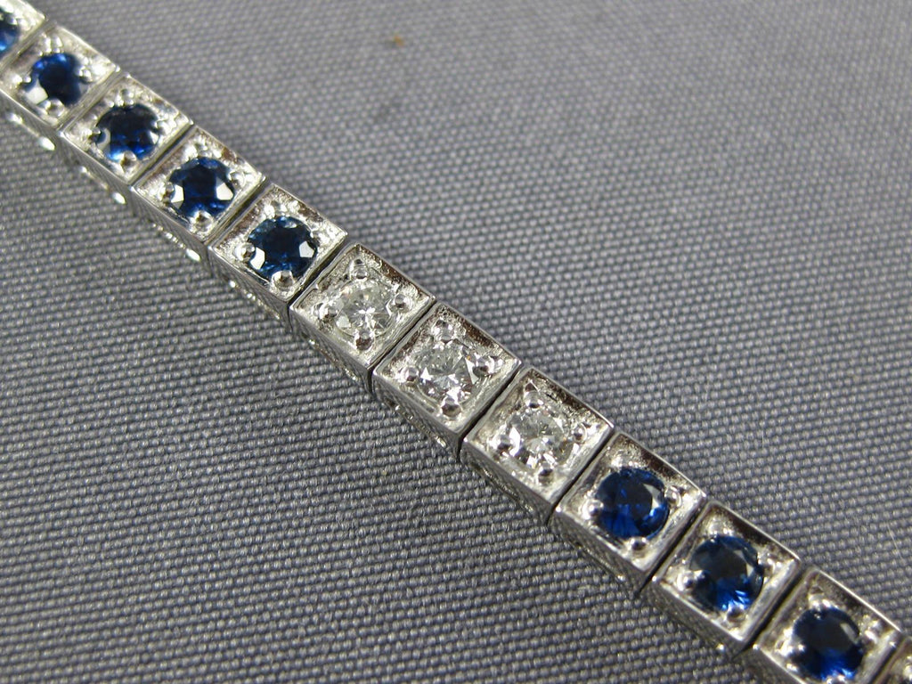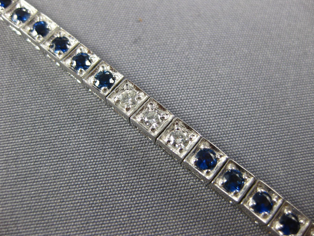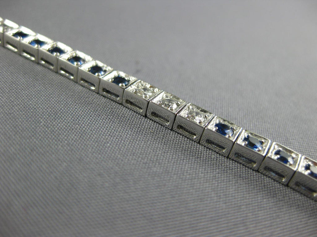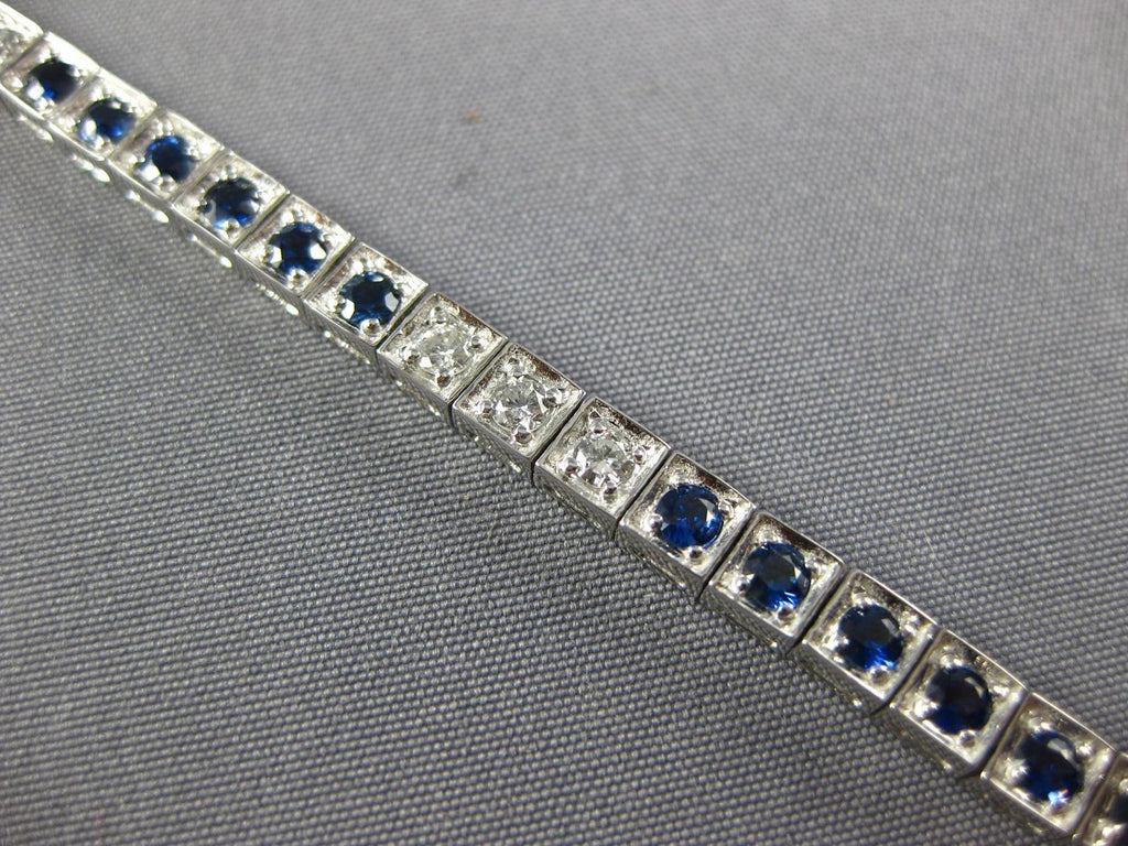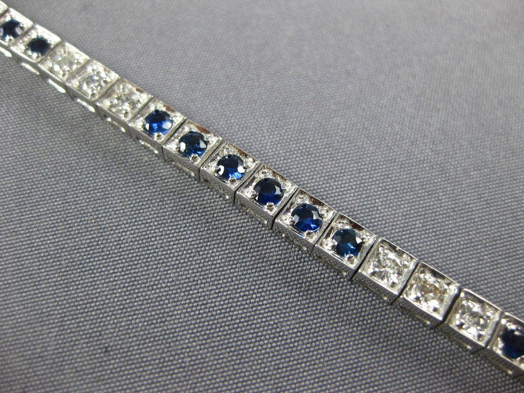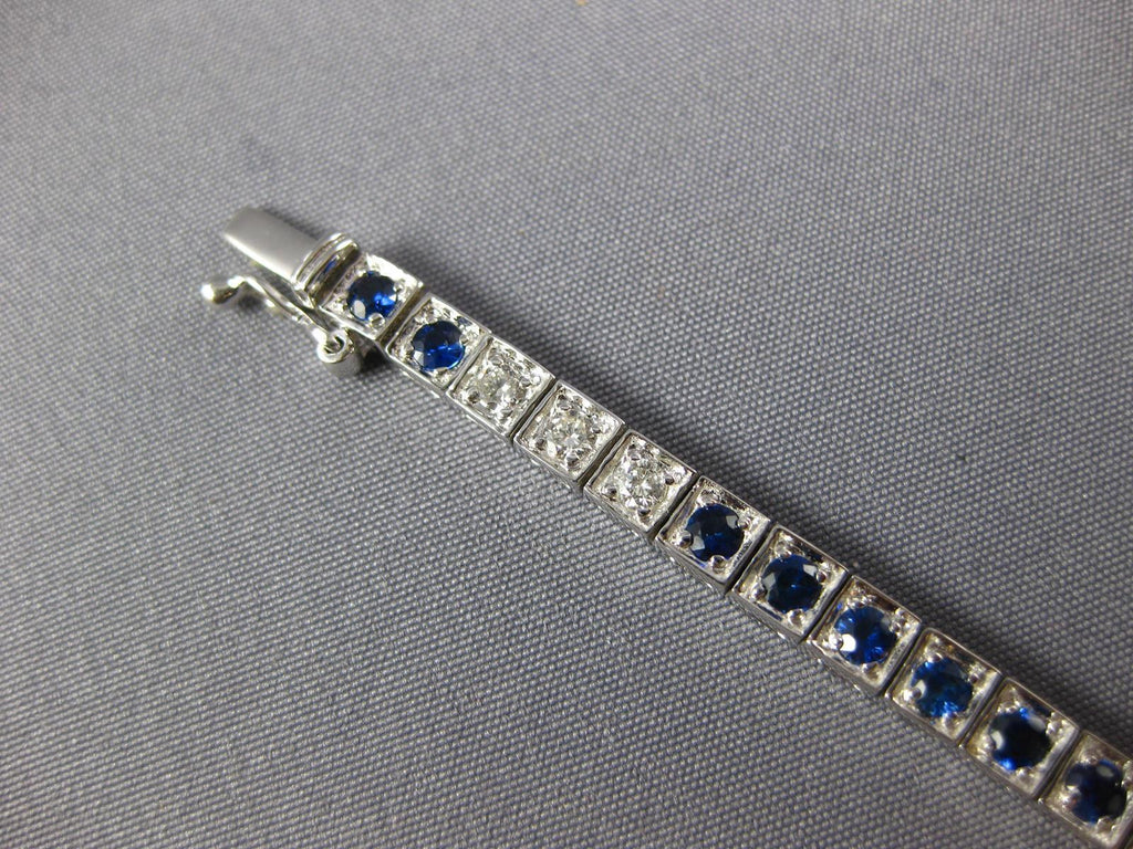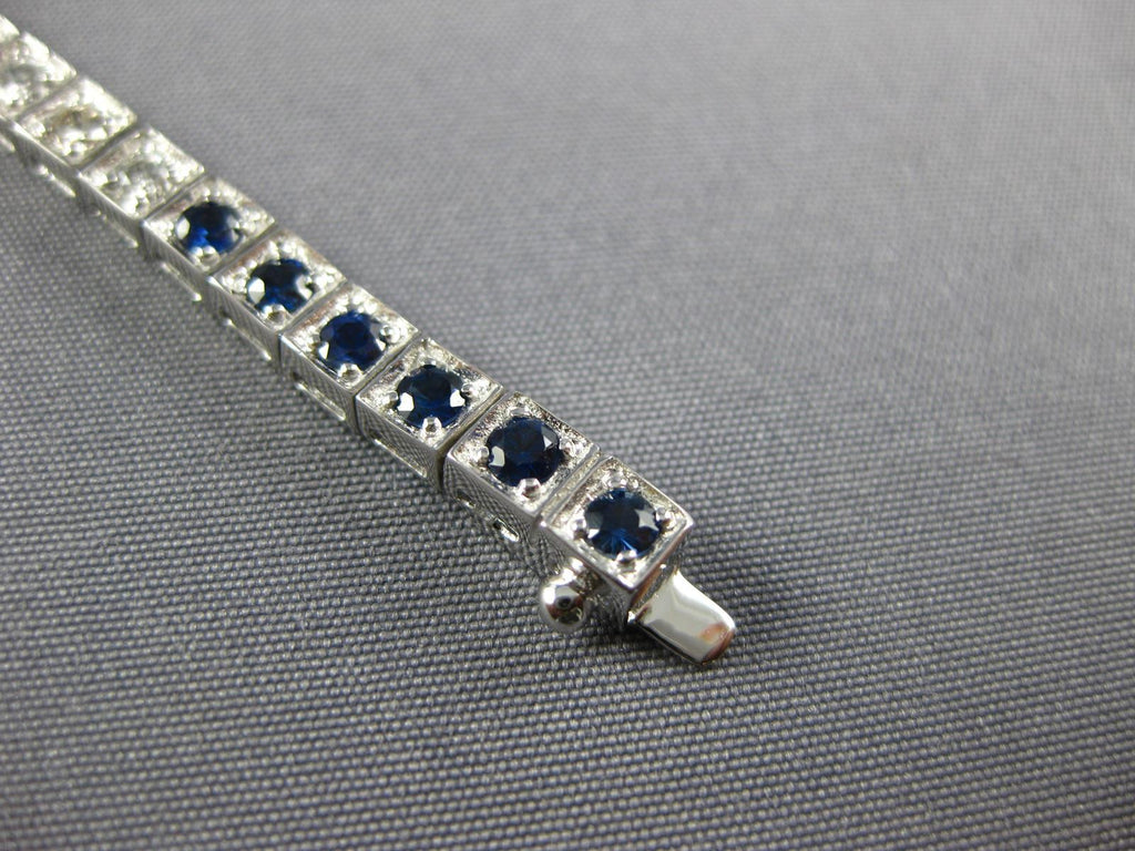 18KT WHITE GOLD TENNIS BRACELET. 3D SQUARE FILIGREE DESIGN. ROUND DIAMONDS ARE F/G COLOR, VSSI CLARITY .77 CARATS. AAA BLUE SAPPHIRES ARE 2.27 CARATS. MEASURES 3.5mm WIDE. 7.25" INCHES LONG. WRITTEN APPRAISAL AVAILABLE. COMES IN A PRESENTABLE GIFT BOX.