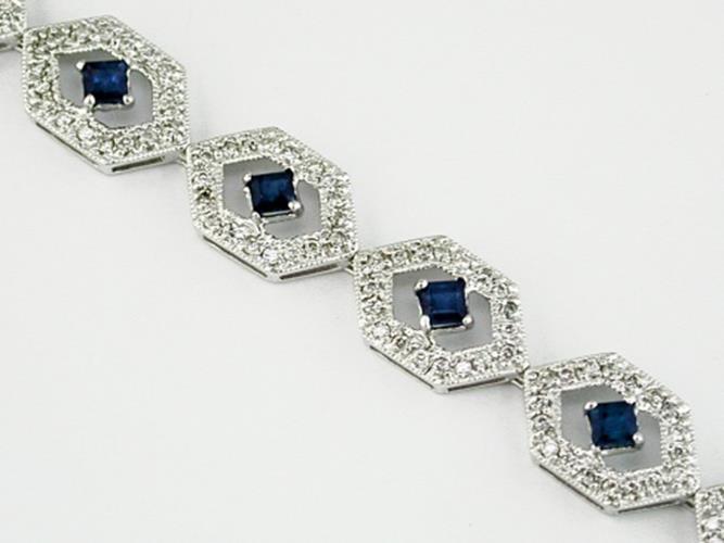 14KT WHITE GOLD TENNIS BRACELET. 3D HEXAGON DESIGN. ROUND DIAMONDS ARE F/G COLOR, VSSI CLARITY 1.15 CARATS. AAA PRINCESS CUT SAPPHIRES ARE 1.90 CARATS. 7" INCHES LONG. WRITTEN APPRAISAL AVAILABLE. COMES IN A PRESENTABLE GIFT BOX.