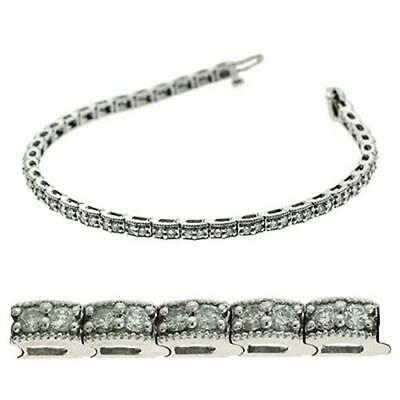 14KT WHITE GOLD TENNIS BRACELET. 3D CLASSIC TWO STONE ETERNITY FILIGREE MILGRAIN DESIGN. ROUND DIAMONDS ARE F/G COLOR, VSSI CLARITY 3.0 CARATS. MEASURES 3mm WIDE. 7" INCHES LONG. WRITTEN APPRAISAL AVAILABLE. COMES IN A PRESENTABLE GIFT BOX.