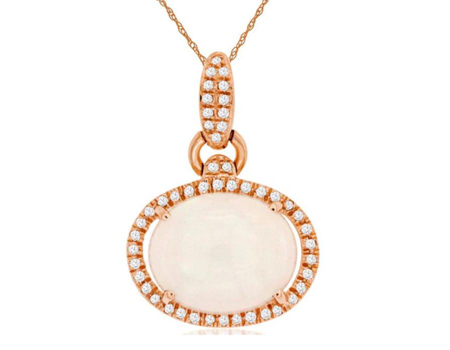 14KT ROSE GOLD FLOATING PENDANT. 3D CLASSIC HALO LOVE KNOT DESIGN. ROUND DIAMONDS ARE F/G COLOR, VSSI CLARITY .14 CARATS. AAA OVAL OPAL IS 3.0 CARATS. COMES ON A 14KT GOLD DIAMOND CUT 18" INCH CHAIN. WRITTEN APPRAISAL AVAILABLE. COMES IN A PRESENTABLE GIFT BOX.