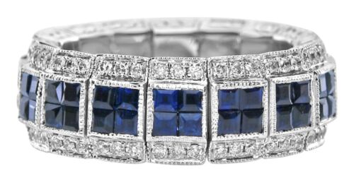 18KT WHITE GOLD ANNIVERSARY RING. 3D INVISIBLE SQUARE ETERNITY DESIGN. ROUND DIAMONDS ARE F/G COLOR, VSSI CLARITY .59 CARATS. AAA PRINCESS CUT SAPPHIRES ARE 2.56 CARATS. RING SIZE 7. CAN BE SIZED BY OUR MASTER JEWELER UPON REQUEST. WRITTEN APPRAISAL AVAILABLE. COMES IN A PRESENTABLE GIFT BOX.