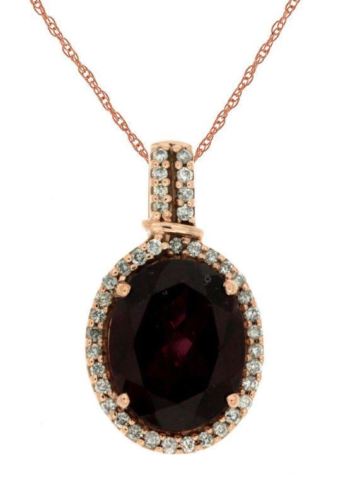 14KT ROSE GOLD PENDANT. 3D HALO CLASSIC DESIGN. ROUND DIAMONDS ARE F/G COLOR, VSSI CLARITY .17 CARATS. AAA OVAL RHODOLITE IS 3.0 CARATS. COMES ON A 14KT GOLD DIAMOND CUT 16" INCH CHAIN. WRITTEN APPRAISAL AVAILABLE. COMES IN A PRESENTABLE GIFT BOX.