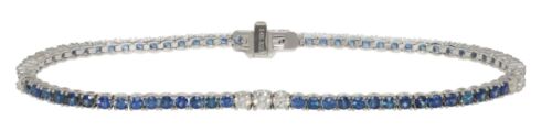 14KT WHITE GOLD TENNIS BRACELET. 3D PAST PRESENT FUTURE BY THE YARD ETERNITY DESIGN. ROUND DIAMONDS ARE G/H COLOR, VSSI CLARITY .50 CARATS. AAA SAPPHIRES ARE 2.68 CARATS.7" INCHES LONG. WRITTEN APPRAISAL AVAILABLE. COMES IN A PRESENTABLE GIFT BOX.