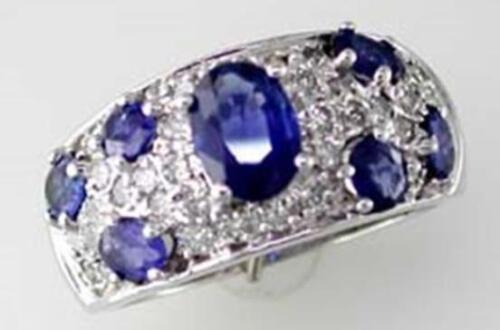 14KT WHITE GOLD FUN RING. 3D ETOILE DESIGN. DIAMONDS ARE F/G COLOR, VSSI CLARITY .70 CARATS. AAA ROUND AND OVAL SAPPHIRES ARE 2.50 CARATS. RING SIZE 7. CAN BE SIZED BY OUR MASTER JEWELER UPON REQUEST. WRITTEN APPRAISAL AVAILABLE. COMES IN A PRESENTABLE GIFT BOX.
