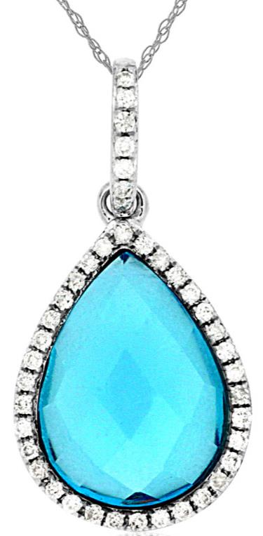 14KT WHITE GOLD FLOATING PENDANT. 3D CLASSIC HALO DESIGN. ROUND DIAMONDS ARE F/G COLOR, VSSI CLARITY .12 CARATS. AAA EXTRA FACETED PEAR SHAPE BLUE TOPAZ IS 3.10 CARATS. COMES ON A 14KT GOLD DIAMOND CUT 18" INCH CHAIN. WRITTEN APPRAISAL AVAILABLE. COMES IN A PRESENTABLE GIFT BOX.