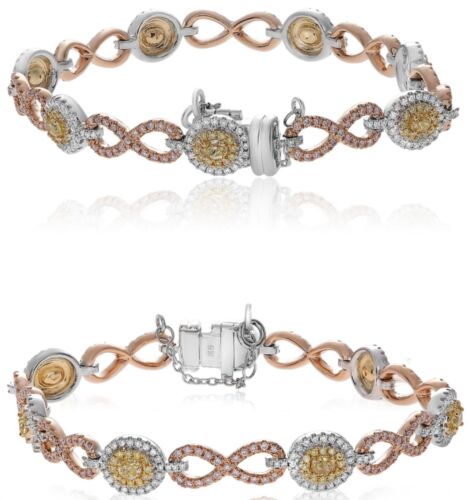 18KT WHITE, YELLOW, AND ROSE GOLD TENNIS BRACELET. 3D FLORAL INFINITY DESIGN. WHITE ROUND DIAMONDS ARE F/G COLOR, VS CLARITY .72 CARATS. FANCY YELLOW ROUND DIAMONDS ARE .33 CARATS. FANCY YELLOW OVAL DIAMONDS ARE 1.45 CARATS. PINK ROUND DIAMONDS ARE .72 CARATS. 7" INCHES LONG.