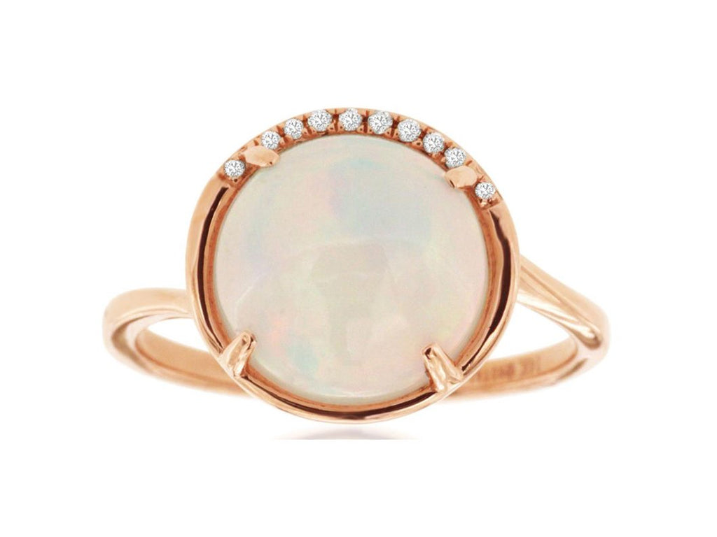 14KT ROSE GOLD FUN RING. 3D CIRCULAR CRISS CROSS DESIGN. ROUND DIAMONDS ARE F/G COLOR, VSSI CLARITY .03 CARATS. AAA ROUND OPAL IS 3.20 CARATS. RING SIZE 7. CAN BE SIZED BY OUR MASTER JEWELER UPON REQUEST. WRITTEN APPRAISAL AVAILABLE. COMES IN A PRESENTABLE GIFT BOX.