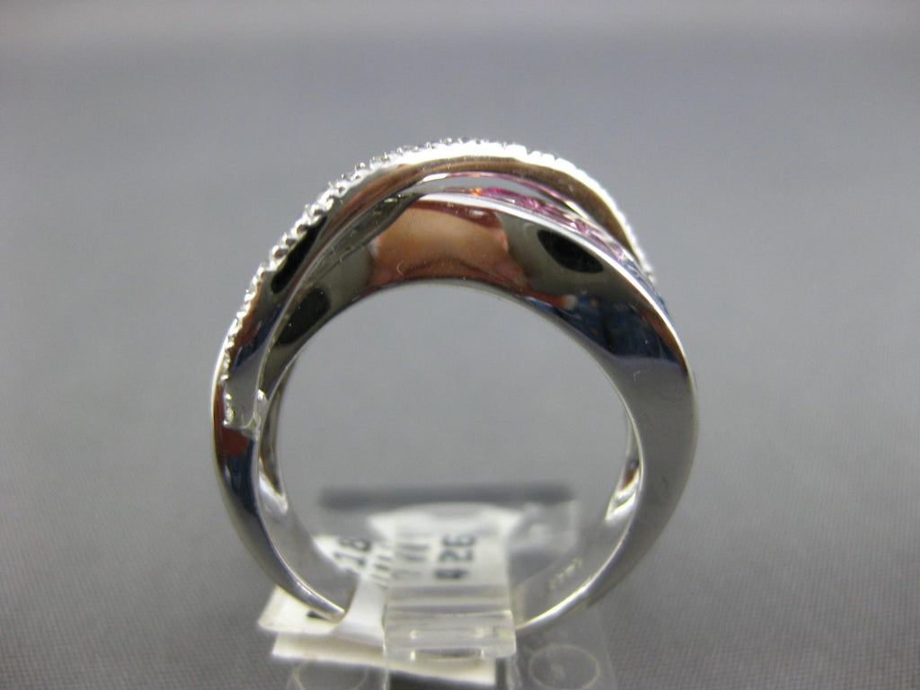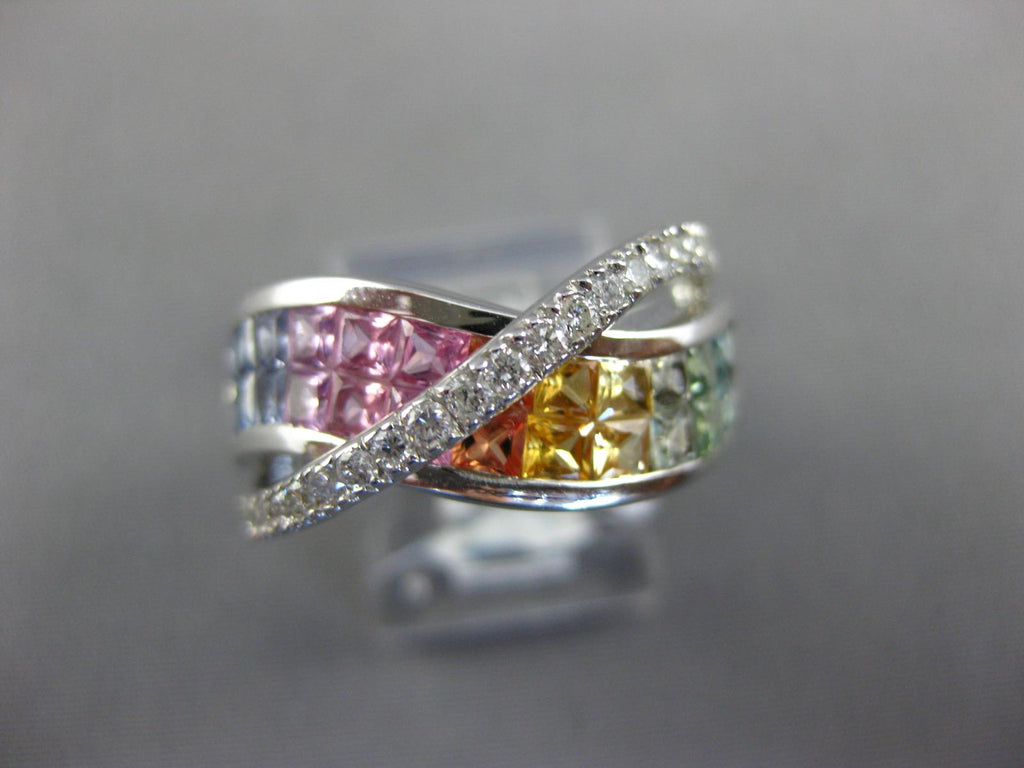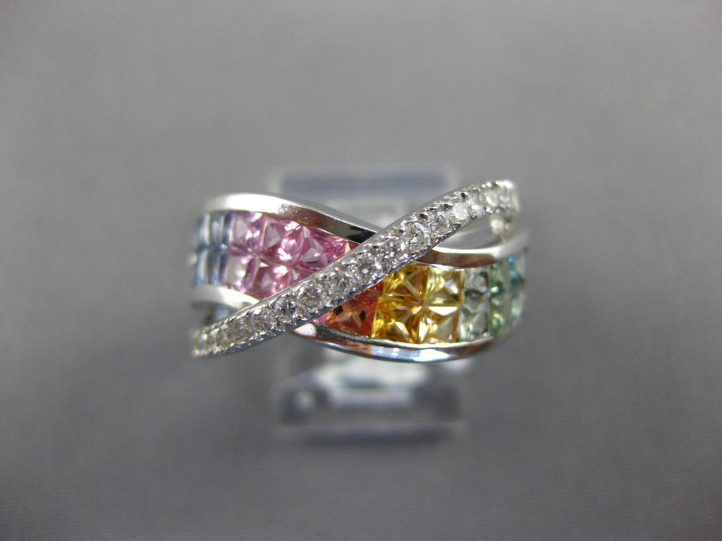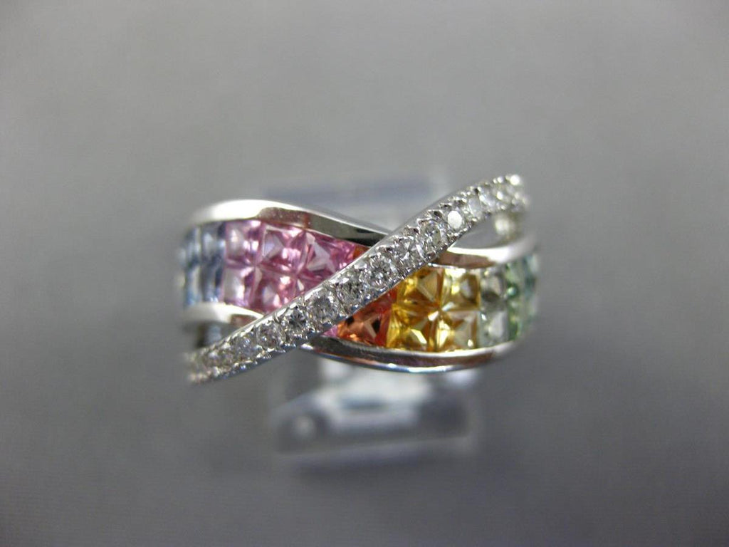 14KT WHITE GOLD LOVE RING. 3D CRISS CROSS INFINITY DESIGN. DIAMONDS ARE F/G COLOR, VSSI CLARITY .42 CARATS. AAA EXTRA FACETED RAINBOW SAPPHIRES ARE 2.60 CARATS. MEASURES 9.5mm WIDE. RING SIZE 7. CAN BE SIZED BY OUR MASTER JEWELER UPON REQUEST. WRITTEN APPRAISAL AVAILABLE. COMES IN A PRESENTABLE GIFT BOX.