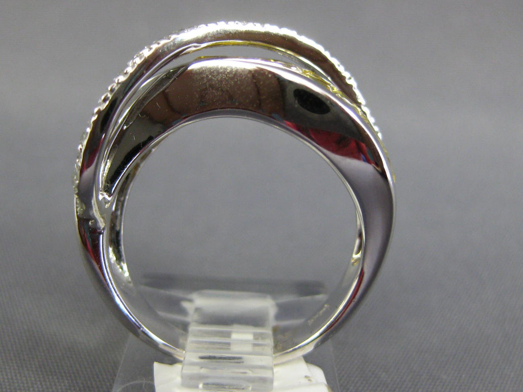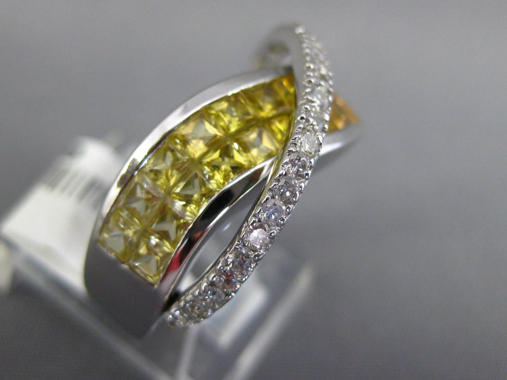 14KT WHITE GOLD FUN RING. 3D INFINITY CRISS CROSS DESIGN. ROUND DIAMONDS ARE F/G COLOR, VSSI CLARITY .42 CARATS. AAA PRINCESS CUT YELLOW SAPPHIRES ARE 2.60 CARATS. MEASURES 7mm WIDE. RING SIZE 7. CAN BE SIZED BY OUR MASTER JEWELER UPON REQUEST. WRITTEN APPRAISAL AVAILABLE. COMES IN A PRESENTABLE GIFT BOX.