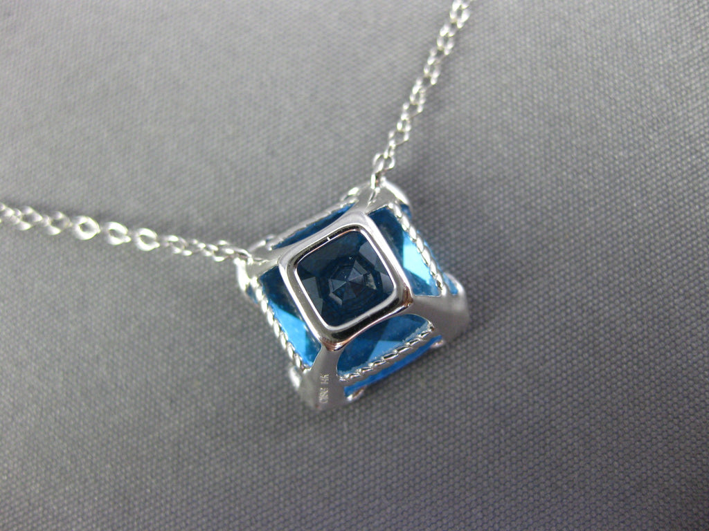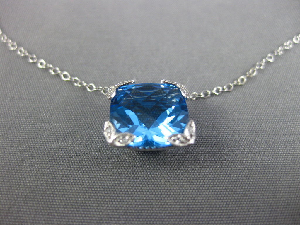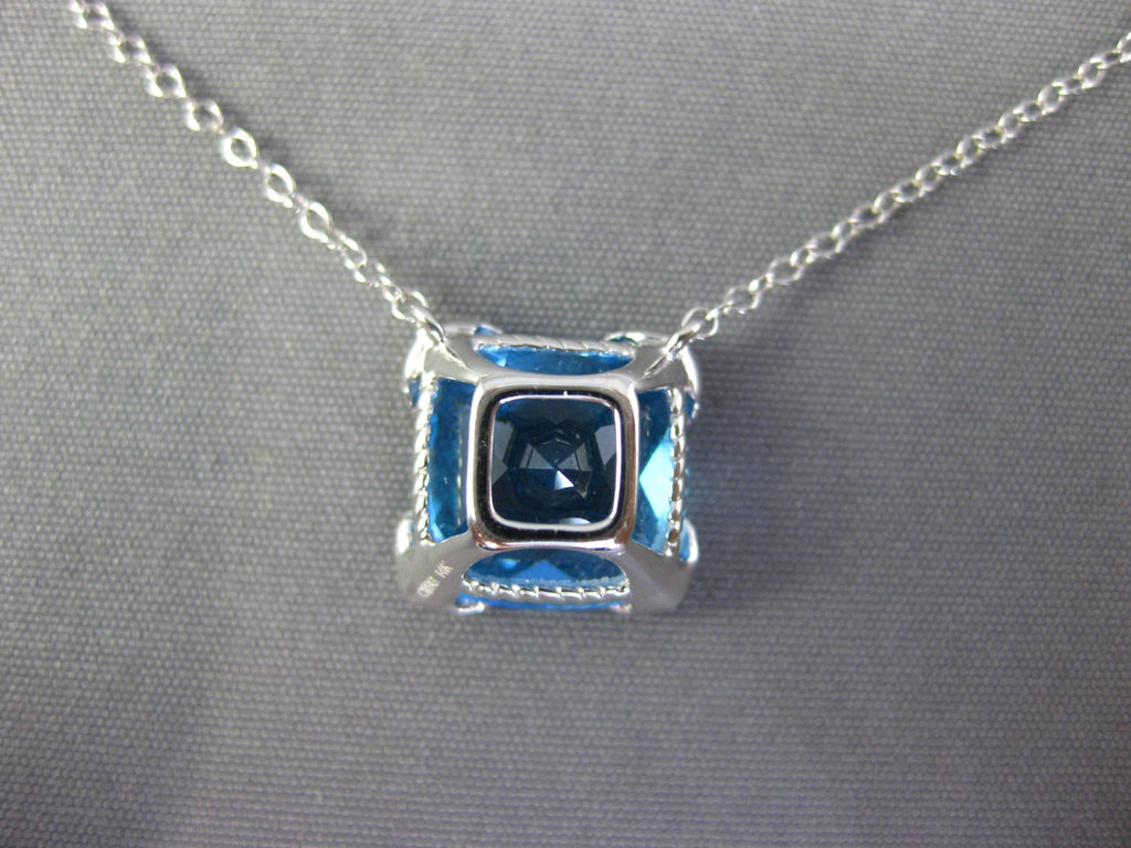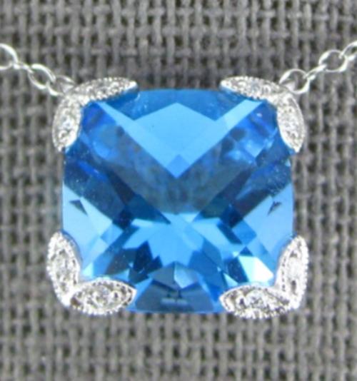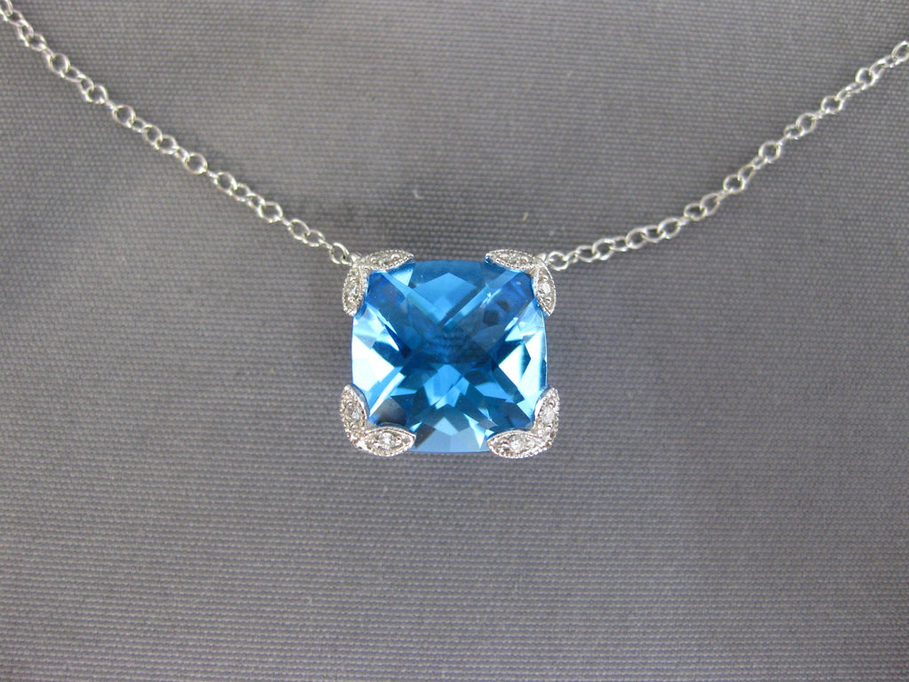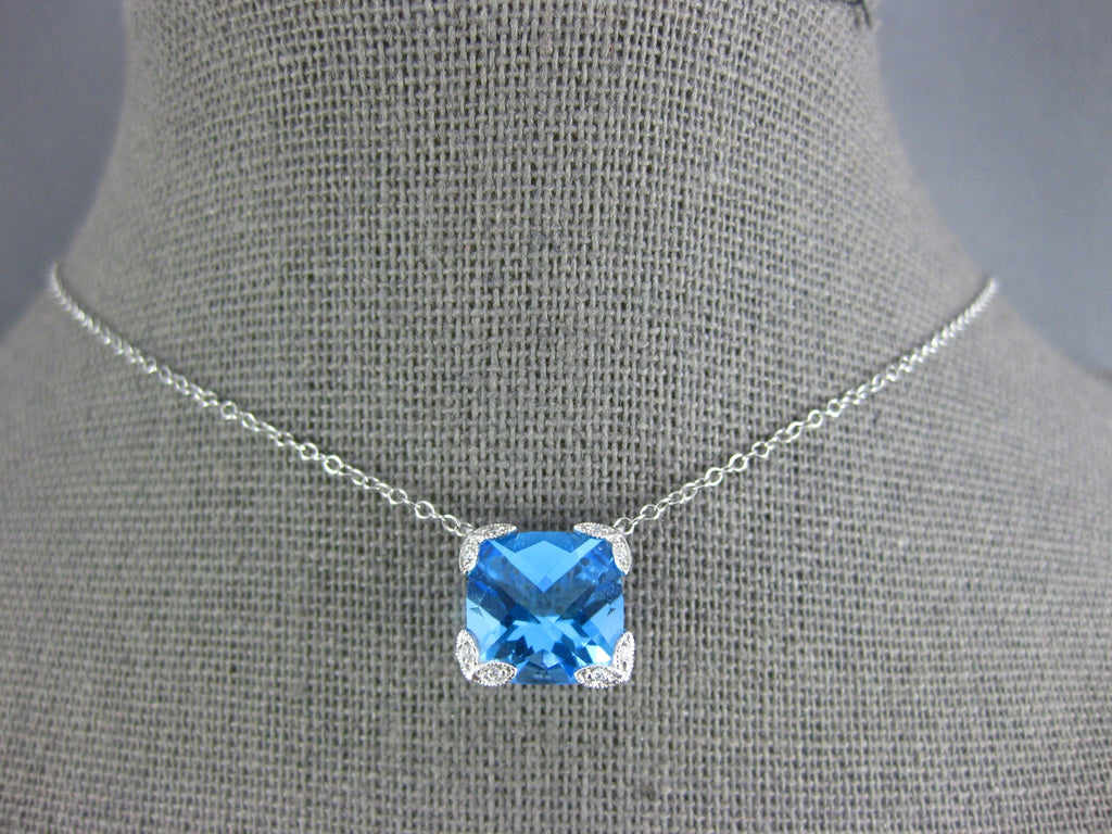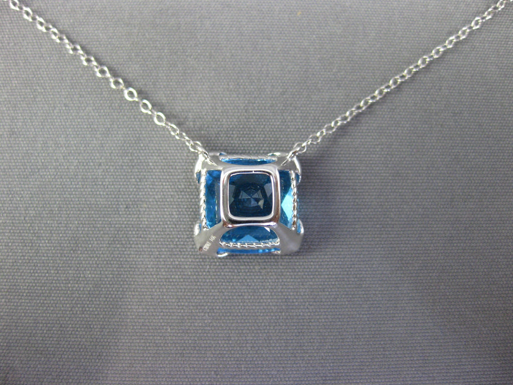14KT WHITE GOLD NECKLACE. 3D SQUARE FILIGREE DESIGN. ROUND DIAMONDS ARE F/G COLOR, VSSI CLARITY .03 CARATS. AAA CUSHION CUT BLUE TOPAZ IS 3.0 CARATS. MEASURES 10mm X 10mm. 18" INCHES LONG. WRITTEN APPRAISAL AVAILABLE. COMES IN A PRESENTABLE GIFT BOX.