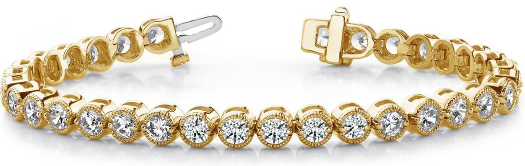 14KT YELLOW GOLD TENNIS BRACELET. 3D CLASSIC BEZEL MILGRAIN ETERNITY DESIGN. ROUND DIAMONDS ARE F/G COLOR, VSSI CLARITY 3.0 CARATS. 7" INCHES LONG. WRITTEN APPRAISAL AVAILABLE. COMES IN A PRESENTABLE GIFT BOX.