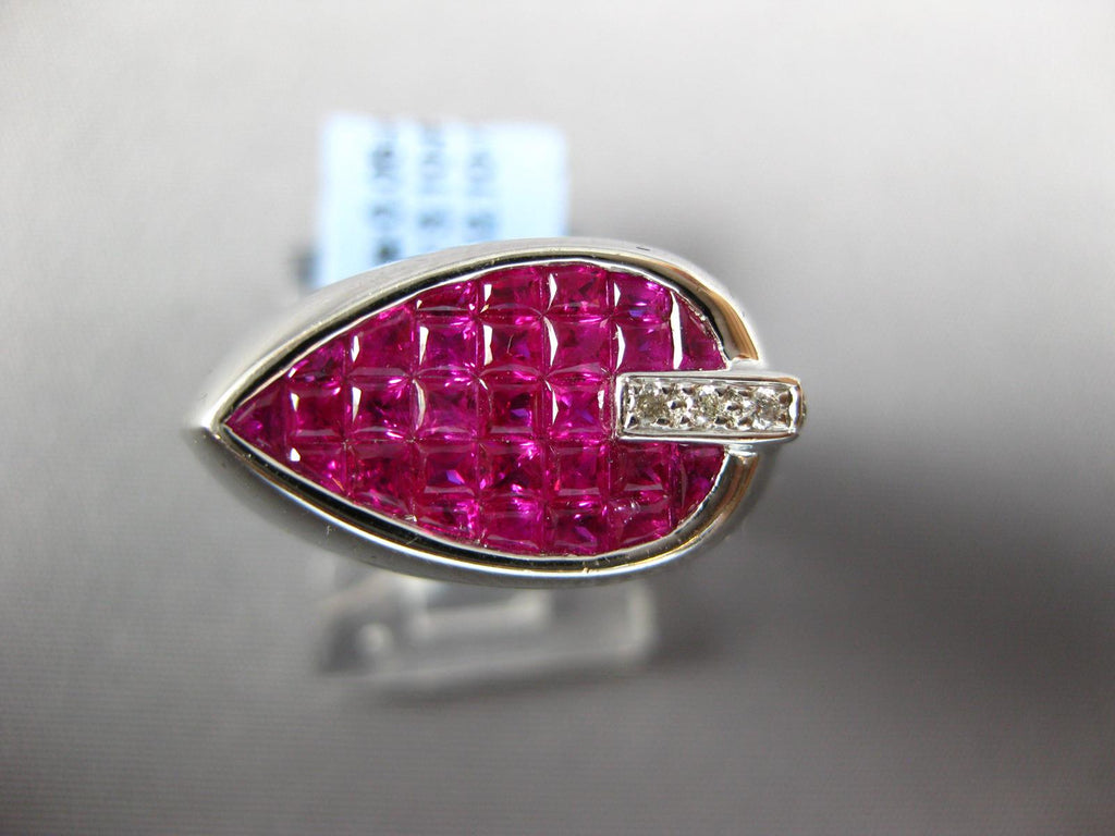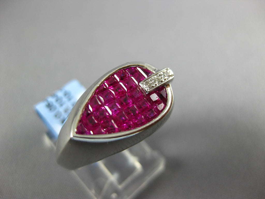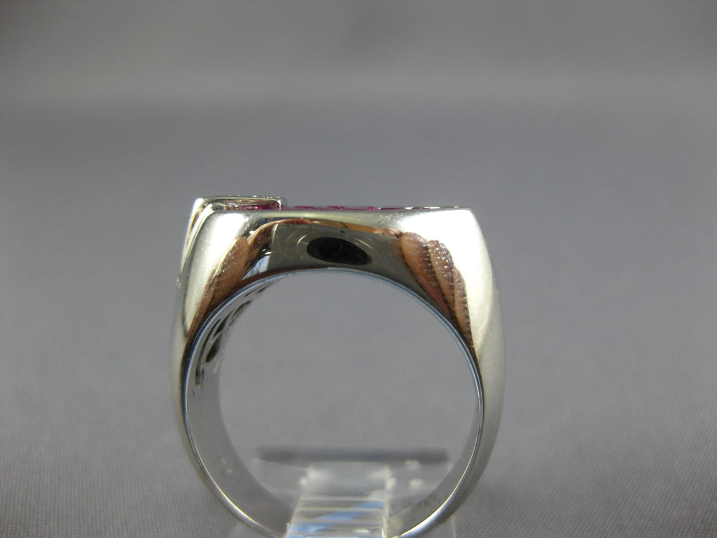 18KT WHITE GOLD MENS PINKIE RING. 3D INVISIBLE TEAR DROP DESIGN. ROUND DIAMONDS ARE F/G COLOR, VS CLARITY .05 CARATS. AAA PRINCESS CUT RUBIES ARE 3.10 CARATS. MEASURES 11mm WIDE. RING SIZE 8. CAN BE SIZED BY OUR MASTER JEWELER UPON REQUEST. WRITTEN APPRAISAL AVAILABLE. COMES IN A PRESENTABLE GIFT BOX.