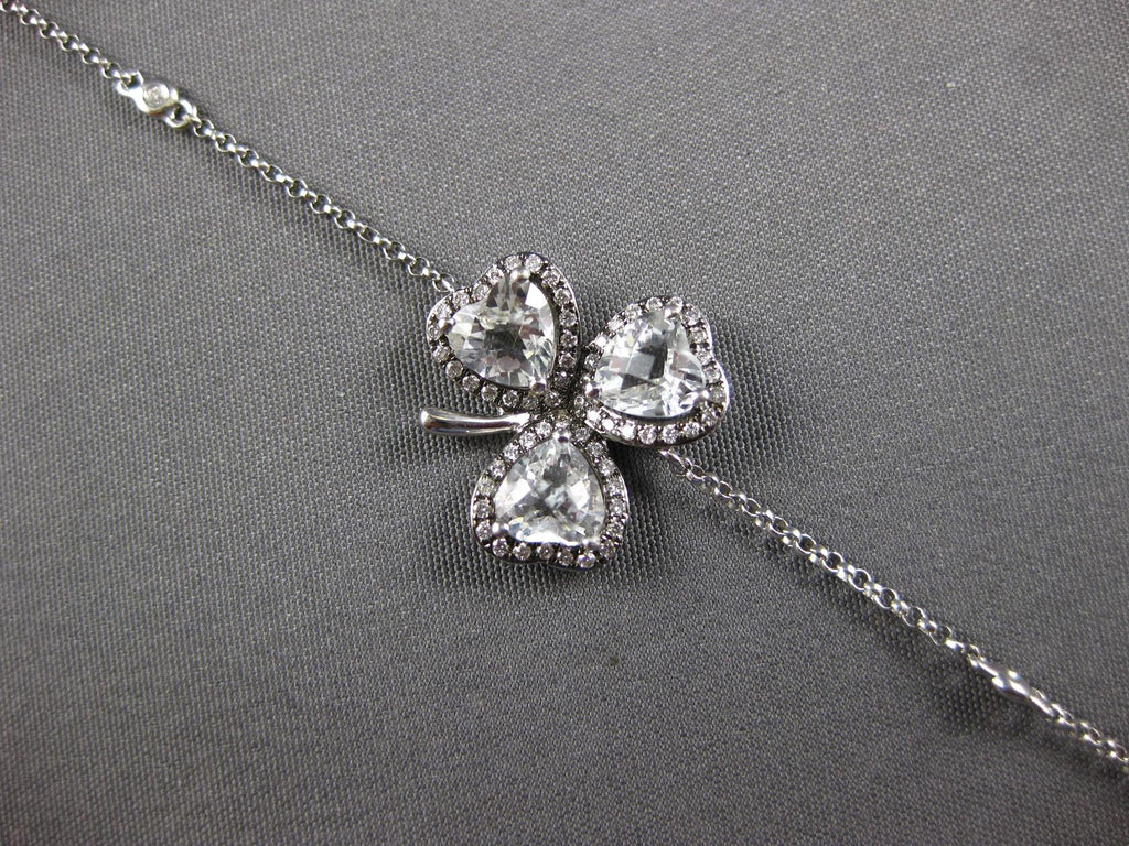 14KT WHITE GOLD LOVE BRACELET. 3D FOUR LEAF CLOVER BY THE YARD DESIGN. ROUND DIAMONDS ARE F/G COLOR, VSSI CLARITY .18 CARATS. AAA HEART SHAPE WHITE SAPPHIRES ARE 3.0 CARATS. MEASURES 15.5mm WIDE. 7" INCHES LONG. WRITTEN APPRAISAL AVAILABLE. COMES IN A PRESENTABLE GIFT BOX.