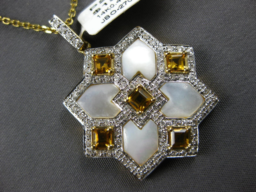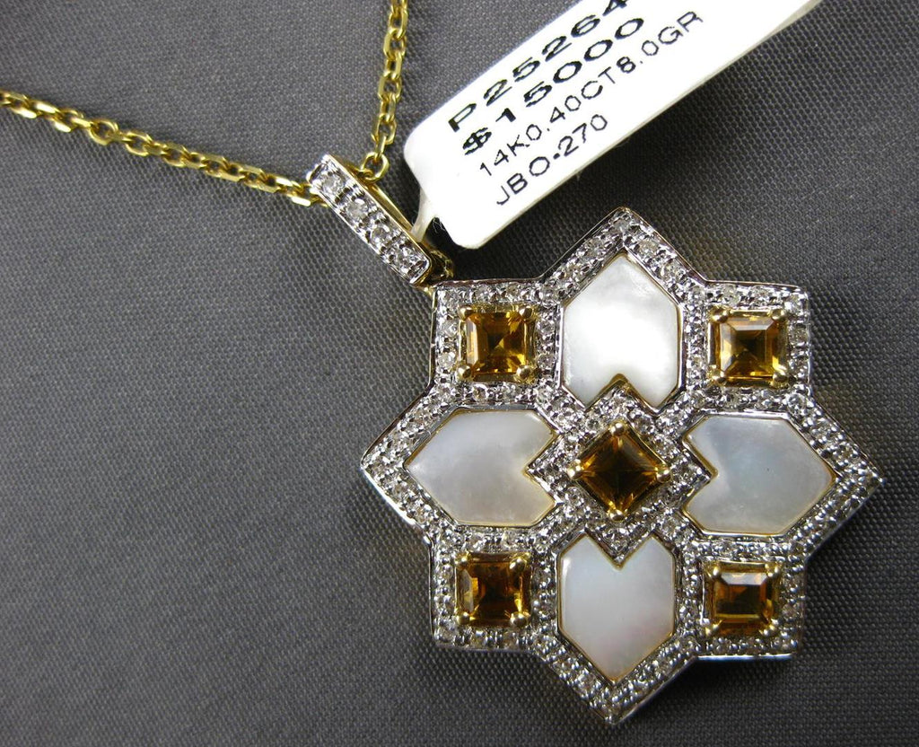 14KT YELLOW GOLD FLOATING PENDANT. 3D SQUARE STAR DESIGN. DIAMONDS ARE F/G COLOR, VSSI CLARITY .40 CARATS. AAA YELLOW SAPPHIRES ARE 2.80 CARATS. FEATURES AAA MOTHER OF PEARL. MEASURES 37mm X 26mm. COMES ON A 14KT GOLD DIAMOND CUT 16" INCH CHAIN. WRITTEN APPRAISAL AVAILABLE. COMES IN A PRESENTABLE GIFT BOX.