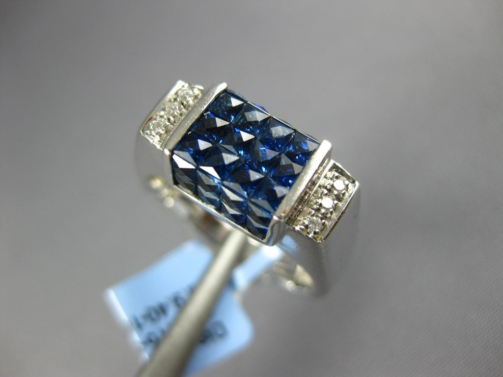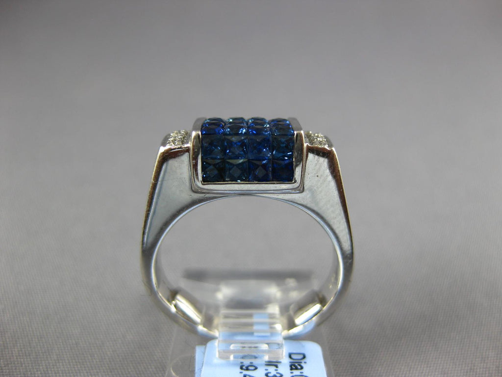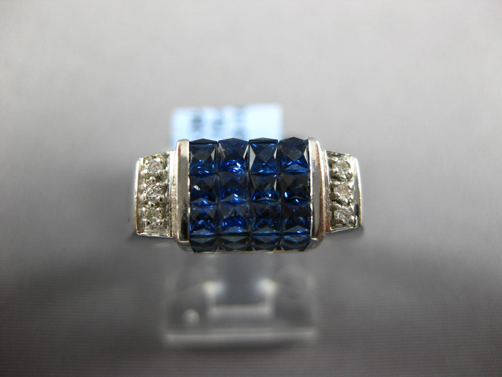 18KT WHITE GOLD FUN RING. 3D INVISIBLE DESIGN. ROUND DIAMONDS ARE F/G COLOR, VS CLARITY .06 CARATS. AAA PRINCESS CUT SAPPHIRES ARE 3.15 CARATS. MEASURES 8mm WIDE. RING SIZE 4. CAN BE SIZED BY OUR MASTER JEWELER UPON REQUEST. WRITTEN APPRAISAL AVAILABLE. COMES IN A PRESENTABLE GIFT BOX.