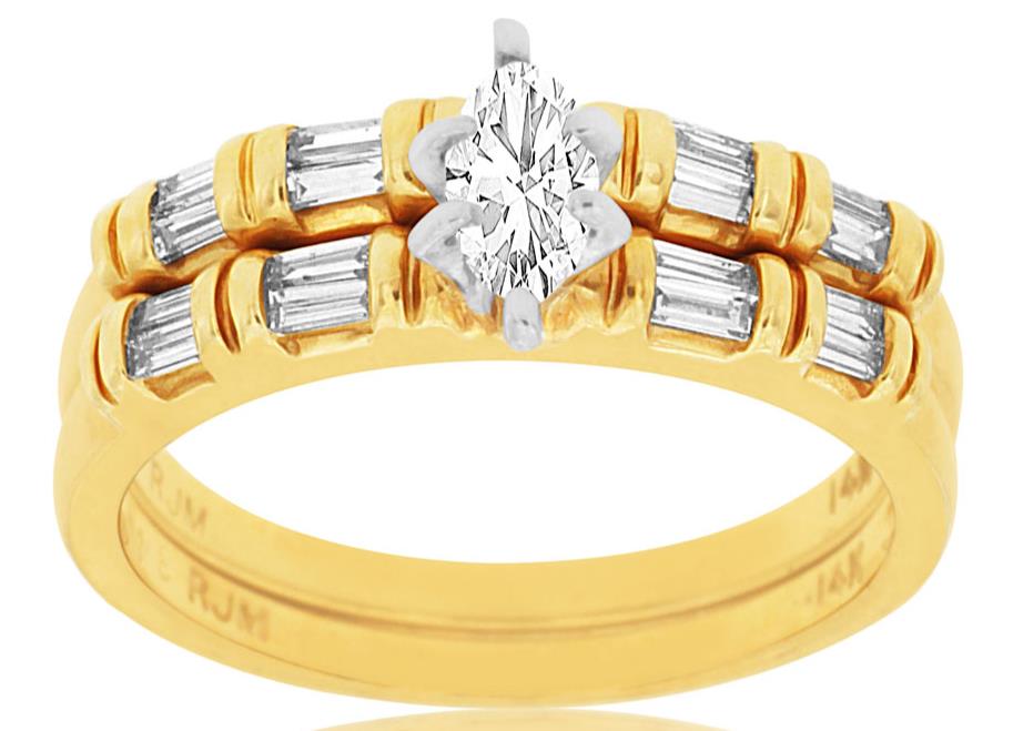 14KT YELLOW GOLD ENGAGEMENT WEDDING RING SET. 3D CLASSIC DESIGN. DIAMONDS ARE F/G COLOR, VSSI CLARITY. CENTER PEAR SHAPE DIAMOND IS .30 CARATS. SIDE BAGUETTE DIAMONDS ARE .33 CARATS. RING SIZE 7. CAN BE SIZED BY OUR MASTER JEWELER UPON REQUEST. WRITTEN APPRAISAL AVAILABLE. COMES IN A PRESENTABLE GIFT BOX.