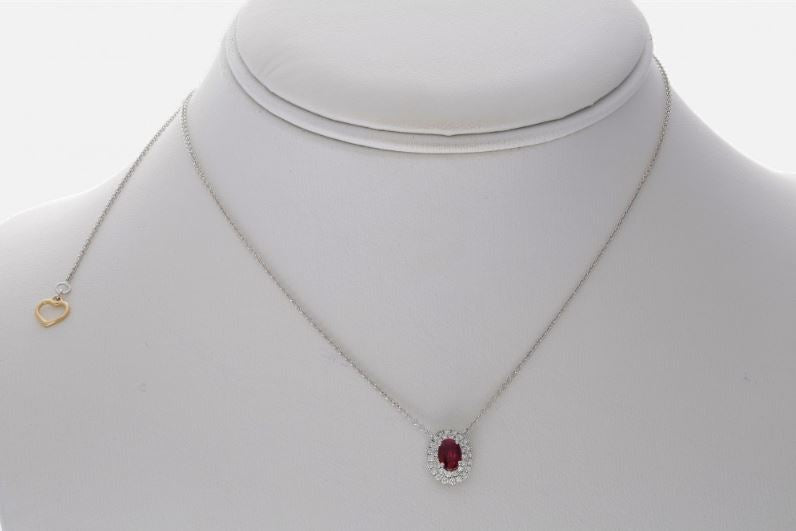 18KT WHITE GOLD LOVE NECKLACE. 3D DOUBLE HALO DESIGN. ROUND DIAMONDS ARE F/G COLOR, VSSI CLARITY .23 CARATS. OVAL AAA RUBY IS .23 CARATS. MEASURES 11mm X 9mm. 16" INCHES LONG. WRITTEN APPRAISAL AVAILABLE. COMES IN A PRESENTABLE GIFT BOX.