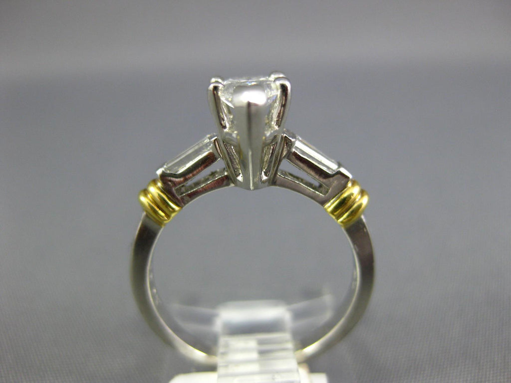 ESTATE PLATINUM AND 18KT YELLOW GOLD ENGAGEMENT RING. 3D THREE STONE DESIGN. DIAMONDS ARE F/G COLOR, VS CLARITY. PEAR SHAPE CENTER DIAMOND IS .73 CARATS. BAGUETTE CUT SIDE DIAMONDS ARE .20 CARATS. MEASURES 9MM WIDE. RING SIZE 5. CAN BE SIZED BY OUR MASTER JEWELER UPON REQUEST. WRITTEN APPRAISAL AVAILABLE. COMES IN A PRESENTABLE GIFT BOX.