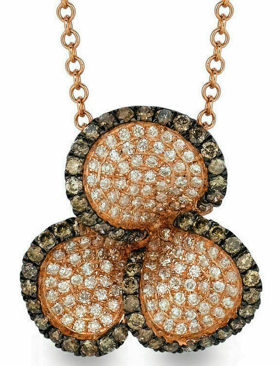 14KT ROSE GOLD PENDANT. 3D THREE LEAF CLOVER FLOWER DESIGN. WHITE DIAMONDS ARE F/G COLOR, VSSI CLARITY .35 CARATS. CHOCOLATE FANCY DIAMONDS ARE .48 CARATS. COMES ON A 14KT GOLD DIAMOND CUT 16" INCH CHAIN. WRITTEN APPRAISAL AVAILABLE. COMES IN A PRESENTABLE GIFT BOX.