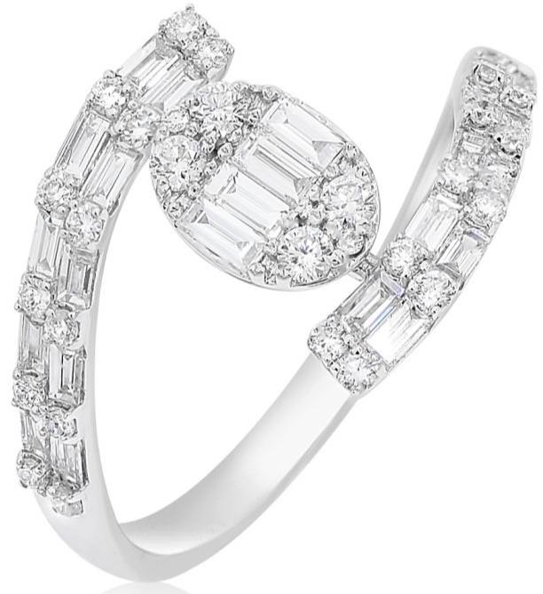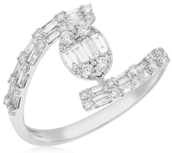 18KT WHITE GOLD LOVE RING. 3D CLUSTER OVAL CRISS CROSS DESIGN. ROUND AND BAGUETTE DIAMONDS ARE F/G COLOR, VSSI CLARITY .74 CARATS. RING SIZE 7. CAN BE SIZED BY OUR MASTER JEWELER UPON REQUEST. WRITTEN APPRAISAL AVAILABLE. COMES IN A PRESENTABLE GIFT BOX.