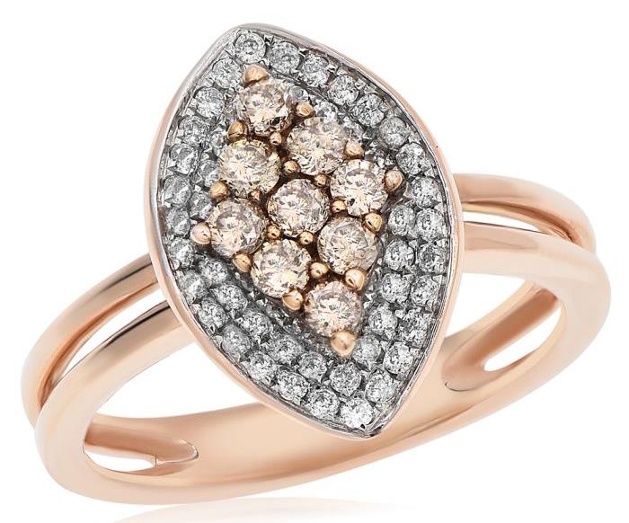 18KT ROSE GOLD FUN RING. 3D CLUSTER MARQUISE SHAPE HALO DESIGN. WHITE DIAMONDS ARE F/G COLOR, VSSI CLARITY .36 CARATS. CHOCOLATE FANCY DIAMONDS ARE .38 CARATS. RING SIZE 7. CAN BE SIZED BY OUR MASTER JEWELER UPON REQUEST. WRITTEN APPRAISAL AVAILABLE. COMES IN A PRESENTABLE GIFT BOX.