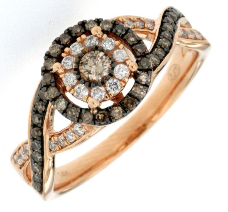 14KT ROSE GOLD LOVE RING. 3D FLOWER INFINITY DESIGN. WHITE DIAMONDS ARE F/G COLOR, VSSI CLARITY .17 CARATS. CHOCOLATE FANCY DIAMONDS ARE .35 CARATS. RING SIZE 7. CAN BE SIZED BY OUR MASTER JEWELER UPON REQUEST. WRITTEN APPRAISAL AVAILABLE. COMES IN A PRESENTABLE GIFT BOX.