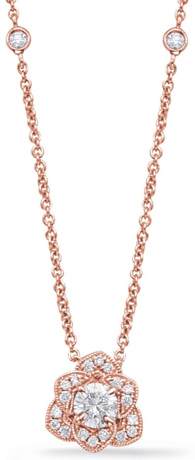 14KT ROSE GOLD NECKLACE. 3D SOLITAIRE FLOWER FILIGREE MILGRAIN BY THE YARD DESIGN. DIAMONDS ARE F/G COLOR, VSSI CLARITY .53 CARATS. 17" INCHES LONG. WRITTEN APPRAISAL AVAILABLE. COMES IN A PRESENTABLE GIFT BOX.