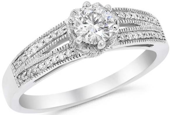 14KT WHITEGOLD FRIENDSHIP PROMISERING. 3D SOLITAIRE FILIGREE MILGRAINDESIGN. DIAMONDS ARE F/G COLOR, VSSI CLARITY. CENTER DIAMOND IS .43 CARATS. SIDE DIAMONDS ARE .13CARATS.RING SIZE 7. CAN BE SIZED BY OUR MASTER JEWELER UPON REQUEST. WRITTEN APPRAISAL AVAILABLE. COMES IN A PRESENTABLE GIFT BOX.