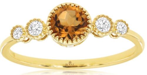 14KT YELLOW GOLD FUN RING. 3D CLASSIC FIVE STONE FILIGREE DESIGN. ROUND DIAMONDS ARE F/G COLOR, VSSI CLARITY .11 CARATS. AAA EXTRA FACETED ROUND CITRINE IS .45 CARATS. RING SIZE 7. CAN BE SIZED BY OUR MASTER JEWELER UPON REQUEST. WRITTEN APPRAISAL AVAILABLE. COMES IN A PRESENTABLE GIFT BOX.